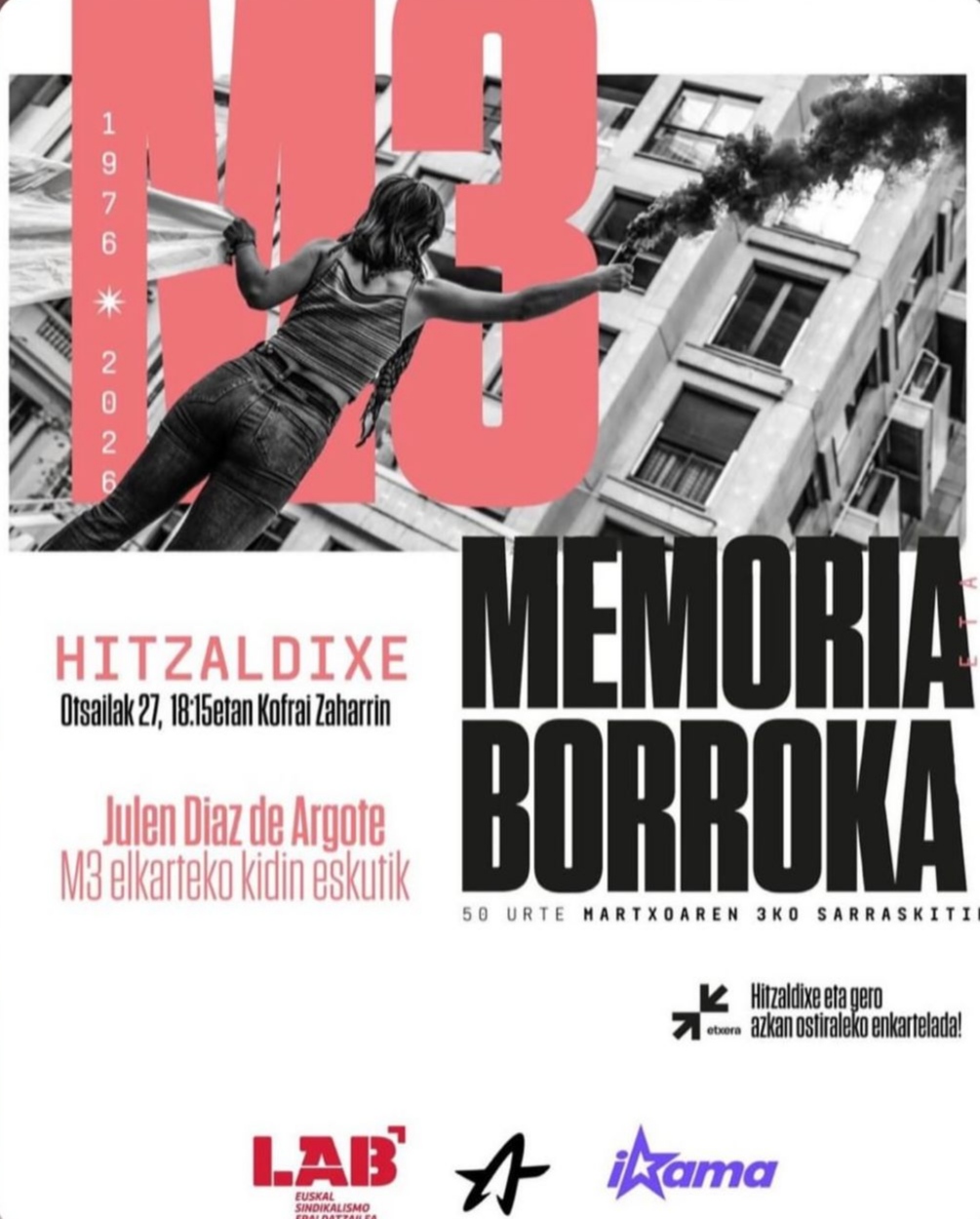 50 urte beteten dizenin Martxoak 3ko sarraskixe gerta zanetik, hitzaldixe antolatu dabe Kofrai Zaharrin egun ilun hori gogoratzeko. Hizlari lez, gai honetan aditu eindan JULEN DIAZ DE ARGOTE etorriko da berba etxea. Gogoratu arratsaldeko 6:15tan hasiko dala berbaldixe ta ondoren hilleko azkan baixakutako enkarteladi eongo dala.