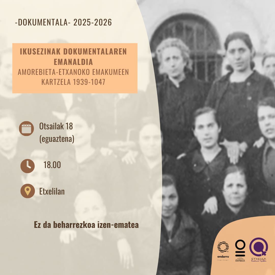 Ongoxe eguaztenin arratsaldeko 6retatik aurrea dokumental emankizune egongo da Etxelilan. Gaxe, AMOREBIETA-ETXANOko emakumin kartzeli 1939 -1947 ingurun. Hurreatu ikus eta entzutea.