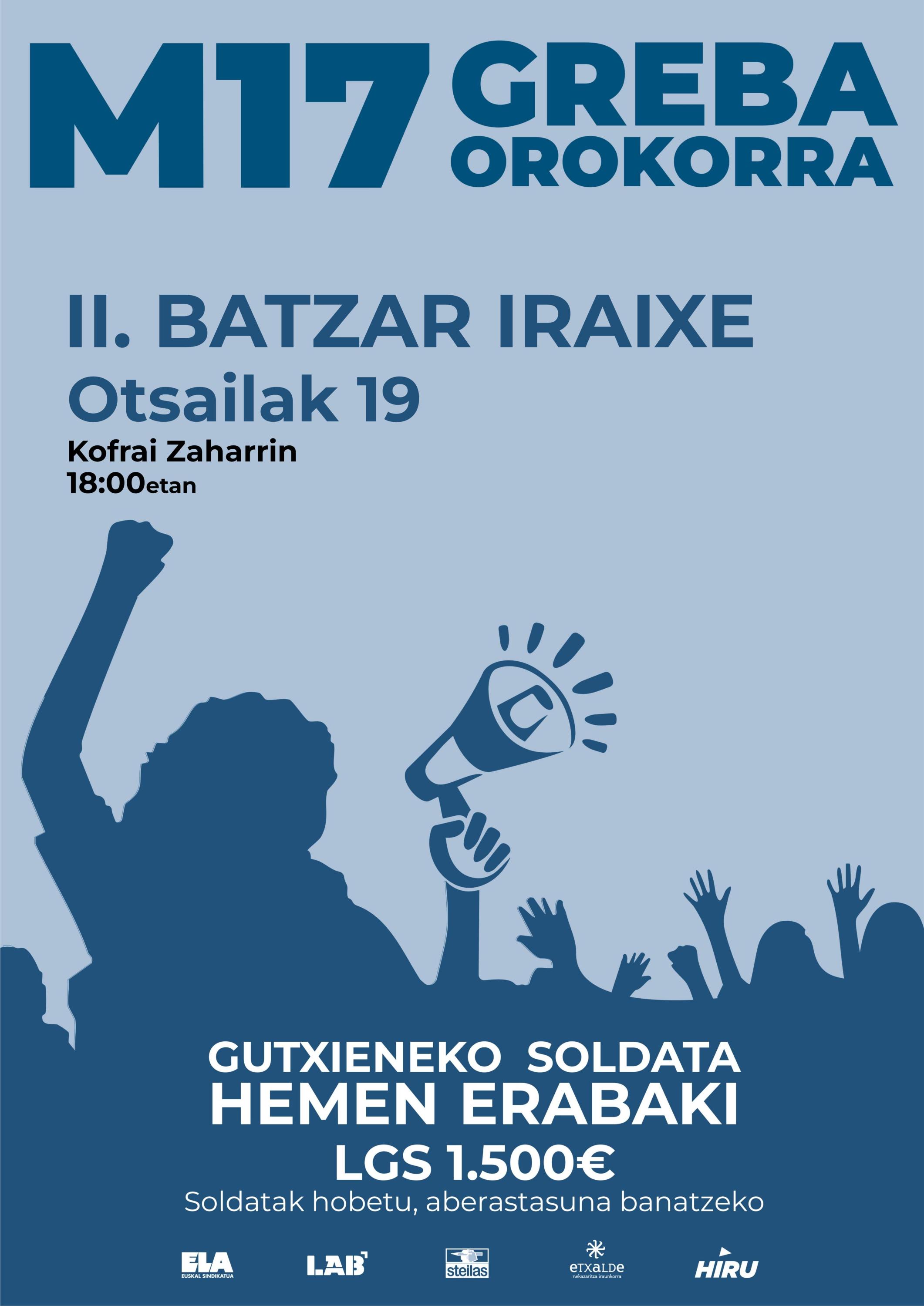 Honezkeo sumako zenduen kalik berotzen hasitxe dazela M-17ko GREBA OROKORRA aurrea eruteko (kalin paperak, pankartak, lantokixetan batzarrak..). Otsailak 19xan (eguena) bigarren batzar iraixe eingo da Kofrai Zaharreko 3.solairun arratsaldeko 6retan. Gutxieneko soldati 1.500 euro eta HEMEN ERABAKI soldatak hobetu aberastasuna banatzeko! Zein egon leike horren kontra? Gitxiauaz ezin leike duin bixi!
