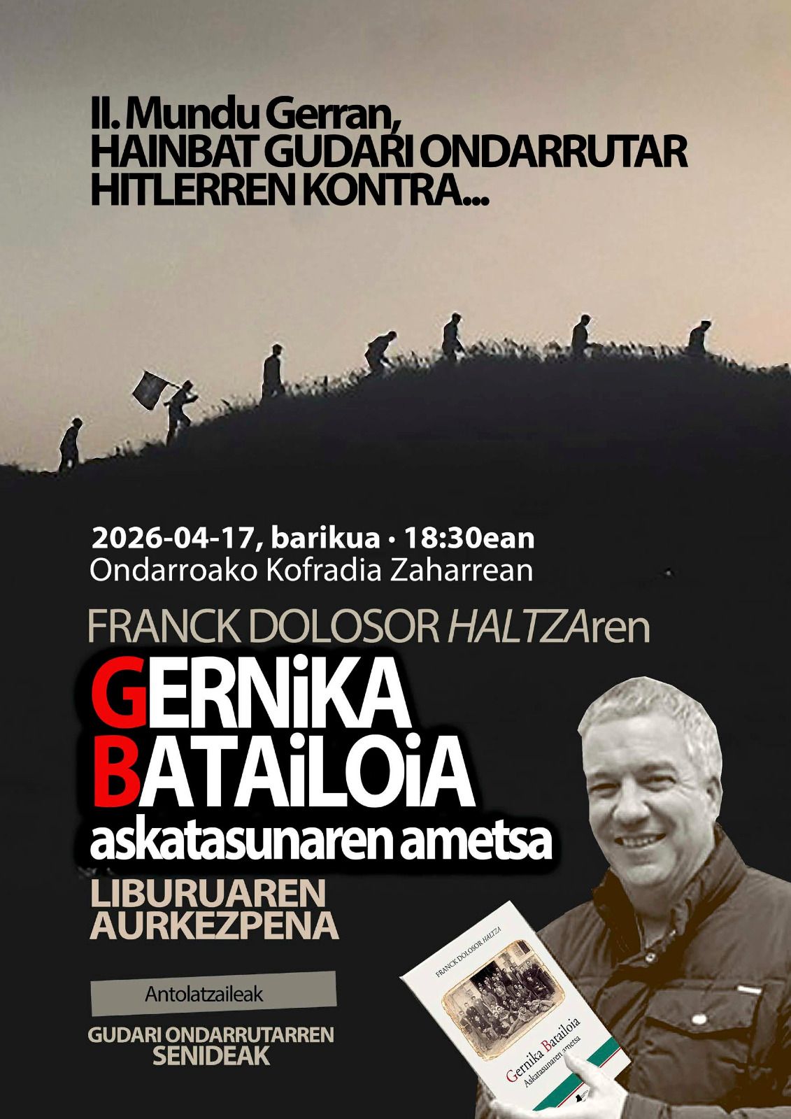 II. Mundu gerran GERNIKA BATALLOI sortu ben Euskaldunak Frantzi aldin Hitlerren gudarostin aurka borrokatzeko ta batalloi horren barrun hainbat Ondarrutarrek (15 lagun baño gexa ei zin) bertan parte hartu benak. Horren guztin harire, FRANCK DOLOSOR HALTZAk Eitbko kazetari ezagunak, liburu bat idatzi dau gai horren bueltan eta Apirilak 17xan (baixaku) aurkezpena eingo dau Kofrai Zaharrin arratsaldeko 6:30xetan. Ekitaldixe,GUDARI Ondarrutarran senidik antolatu dabe. Hurreatu entzutea!