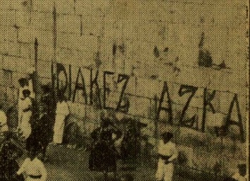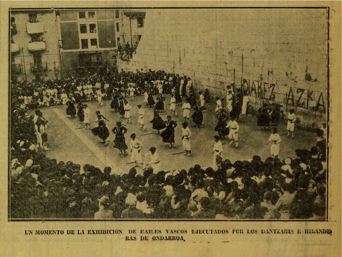 Goiko argazkiak 1933koak dira, eta Ondarroako frontoia agertzen da beraietan. Orduan ere egunerokotasun politikoa oso bizia zen herrian. Karlistek eta EAJk elkarren kontra lehia handia zeukaten, eta hori kaleetan islatzen zen. Tartean, atxilotuak ere egon ziren. Haietako bat izan zen Idiakez gazte jeltzalea. Atxiloketa hori salatzeko EAJk eskura zeuzkan bitarteko guztiak erabili zituen, eta tartean paretak ere margotu zituen. Argazkiak dira horren lekuko, frontoian ‘Idiakez Azkatu’ irakurri daiteke eta.