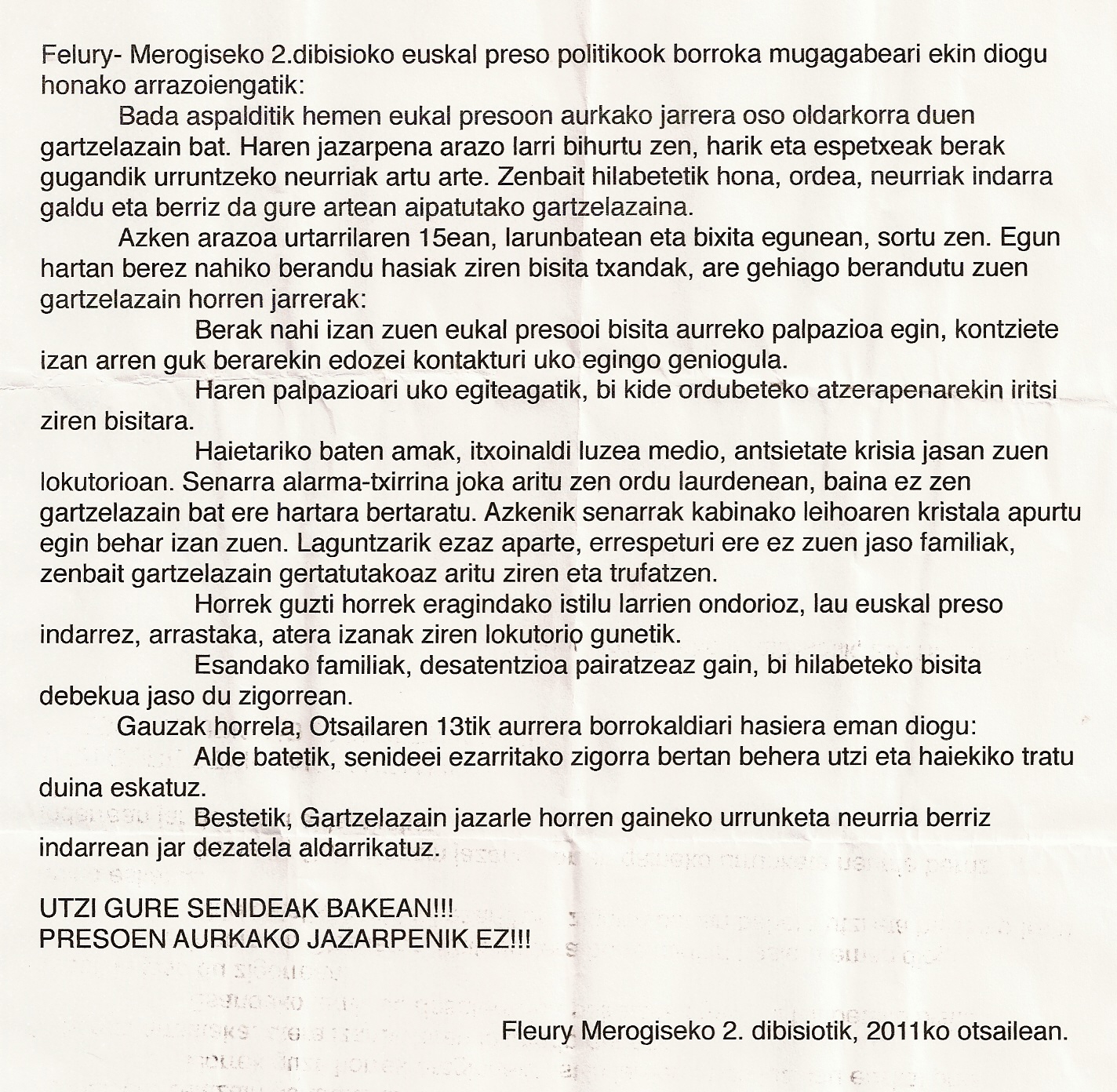 FLEURY-MEROGIS 2. Dibisioko Euskal preso politikoak Otsailaren 13an hasi zuten borrokalditik atera berri dira, borrokaldiak Otsailaren13tik 19ra iraun du. Borrokaldi hau eteteaaren arrazoia, beraien konsigna gehienak onartuak izan direla da, hau da beraien kontra jazarten zebilen gartzelazaina beste leku batera trasladatua izan da eta beraiek zigor-gelatik atera dituzte. Baina bi hilabete bisitaldirik gabe geratzeko zigorra ezarri zaien senideak berdin jarraitzen dute, hau da, zigorrak bere horretan jarraitzen du.