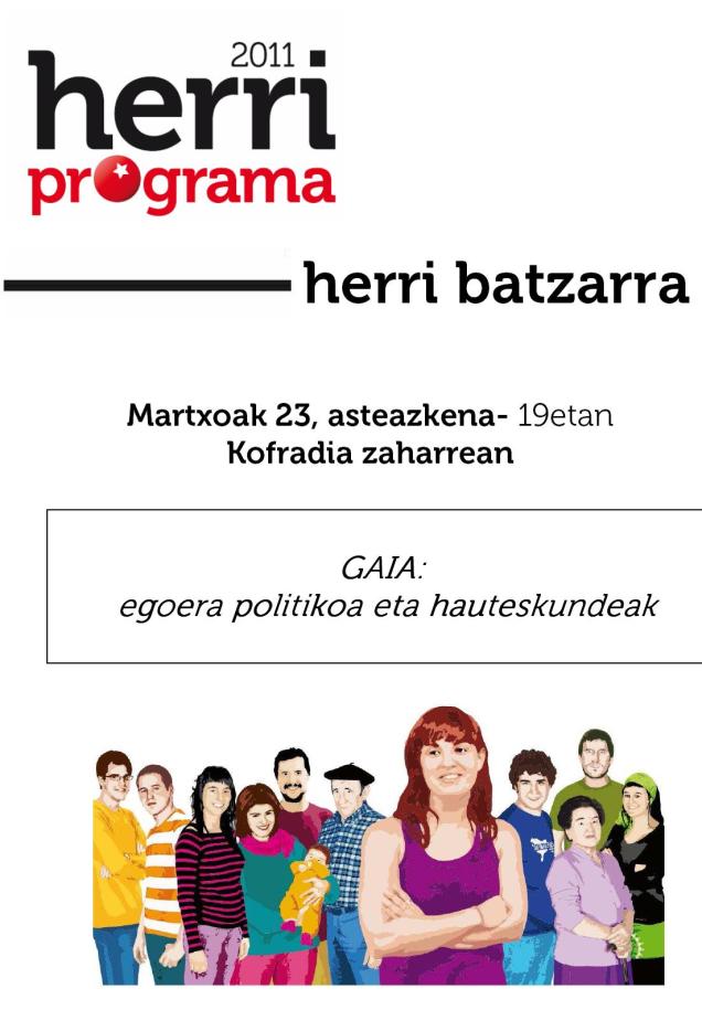 Aurtengo eta datorren urteko Aberri Egunak deitzen ditugu gaurko agerraldi honen bidez. Aurtengoa, Euskal Herriko bi puntutan deituko dugu, Gernikan eta Baigorrin, eta hurrengo urtekoa, Iruñean. 2011 eta 2012, Baigorritik eta Gernikatik, Iruñera. Gernika, gure askatasunaren ikurra, Baigorri, nafar lurralde batasunaren ikurra eta Iruñea, Nafarroako Erresumako eta Euskal Herriko hiriburua, lotu nahi nahi ditugu bi urte hauetan.