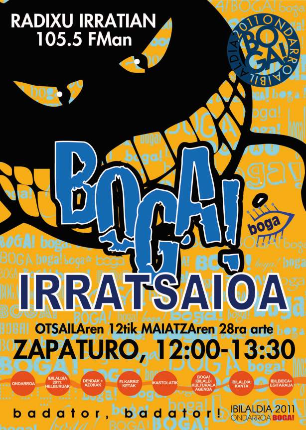 BOGA! IRRATSAIOA Radixu Irratian (105.5 FM). 12:00-13:30. Gaur Aitzol Aramaio Bengoetxea zinegile ondarrutarrari buruz berba egingo dugu. Ibilaldi Kulturaleko agendaren AZKEN TXANPA! 1.500 lagun baietz! lanerako deialdia. Eta Ibilaldia eguneko egitaraua eta ibilbidearen zehaztasun txiki batzuk plazaratzen joango gara. Herri Urratserako (maiatzak 8, Senpereko lakuaren bueltan) autobuserako izena ematea zabalik, deialdia