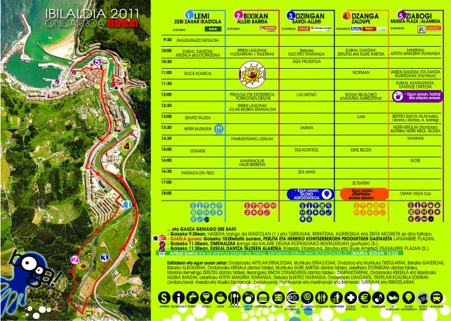 1.GUNEA: LEMI (ZUBI ZAHAR IKASTOLA) 9.30 Inaugurazio ekitaldia (Turrunak, Irrintziak, aurreskua, zinta mozketa) 10.00 Euskal dantzak: Kresala (Ondarroa) eta Etorkizuna (Lekeitio) 11.00 Rock konboa (Ondarroa eta Bermeoko Musika Eskolak) 13.00 Zehatz taldea 13.30 Herri bazkaria 15.00 Sokaide 16.30 Pantxoa eta peio