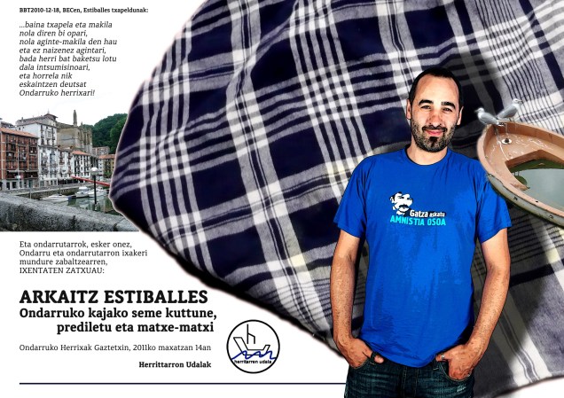 “Kultura arloan esparru ezbardinak suspertzen ahalegintzea eskatuko genioke Ondarroako Udal Gobernu Barriari, eta BIZITZA OROKORREAN GUZTION PARTAIDETZAGAZ ONDARROA GIZAKOIAGOA EGITEN JARDUTEA” (Izki larriak nireak dira), (Ikus HITZA, 2011-05-11, 2. or.).