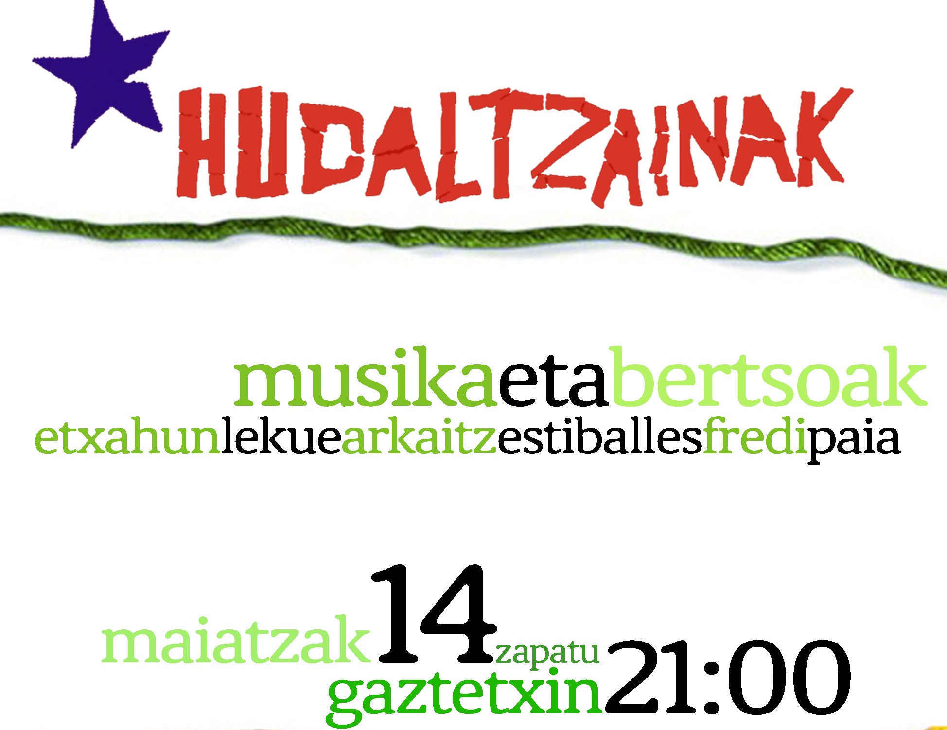 Nahi batzazue muso handi bat emon Arkaitz Estiballesei Ondarruai makilli eskaintzearren 2010eko Bizkaiko Txapelketan, (eta danoi belaunak dardaraka ipini, jilipolla arpeixaz, eta berba baik eta moko daixola emozionata danok, eta, zeatxik ez, danok ordundik lepo zabal-zabalik kaji atata mundun tzir, hain atata ze, kalik be zabaltzeko premiñi dakarrela geu bertatik pasa ahal ixateko… igual horretxeatxik daz hainbeste obra ingurun?) ba zapatun dakazue aukeri, Gaztetxin gabeko 9xetan: Udaltzainak, Estiballes, Lekue eta Paia. Bertsotan, klaro. (ze pentsaten zenduen ba? Striptise?)