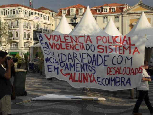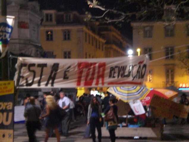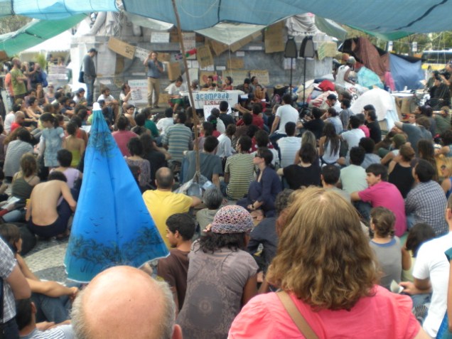 Argazkixetan ikusten dan modure, Lisboan be benetako demokrazixi eskatzeko akanpadak eitxuez Praça do Rossion.