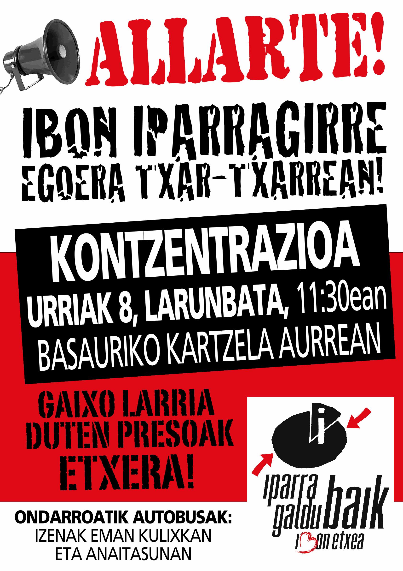 Azken analisien emaitzen arabera -irailaren 19an atera zioten odola- Ibonen osasun egoera zeharo okertu da Basaurin dagoenetik. Hori dela eta ostegunean -urriak 6- Jaiki Hadik urjentziazko prentsaurrekoa emango du datu zehatzak eskainiz, eta Iparra Galdu Baik Plataformak datorren larunbatean Basauriko kartzelaren aurrean kontzentrazio batera deitu du, 11:30etatik aurrera.