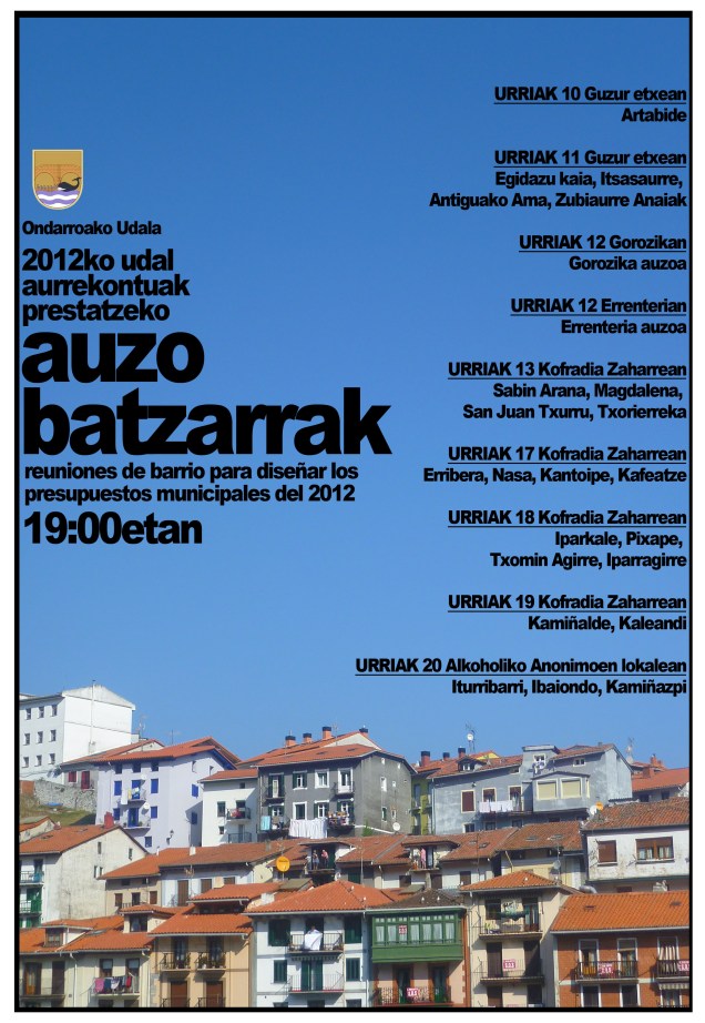 Auzo batzarrak gaurtik aurrea 2011/10/10turrune “Herrixe udaletxea” aldarrikatu gendun hauteskunde kanpainan, eta on hamen dakau aukeri geure herrixe eta auzuk zelakuk ixan bir dizen eztabaidatzeko. Anima eta parte hartu auzo batzarretan! Partekatu hau: Click to share on Facebook (Opens in new window) Facebook Click to share on X (Opens in new window) X Atsegin dut Kargatzen...