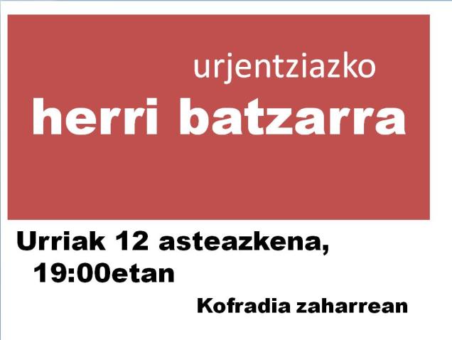 Urjentziazko herri batzarra, urriak 12 2011/10/11turrune Partekatu hau: Click to share on Facebook (Opens in new window) Facebook Click to share on X (Opens in new window) X Atsegin dut Kargatzen...