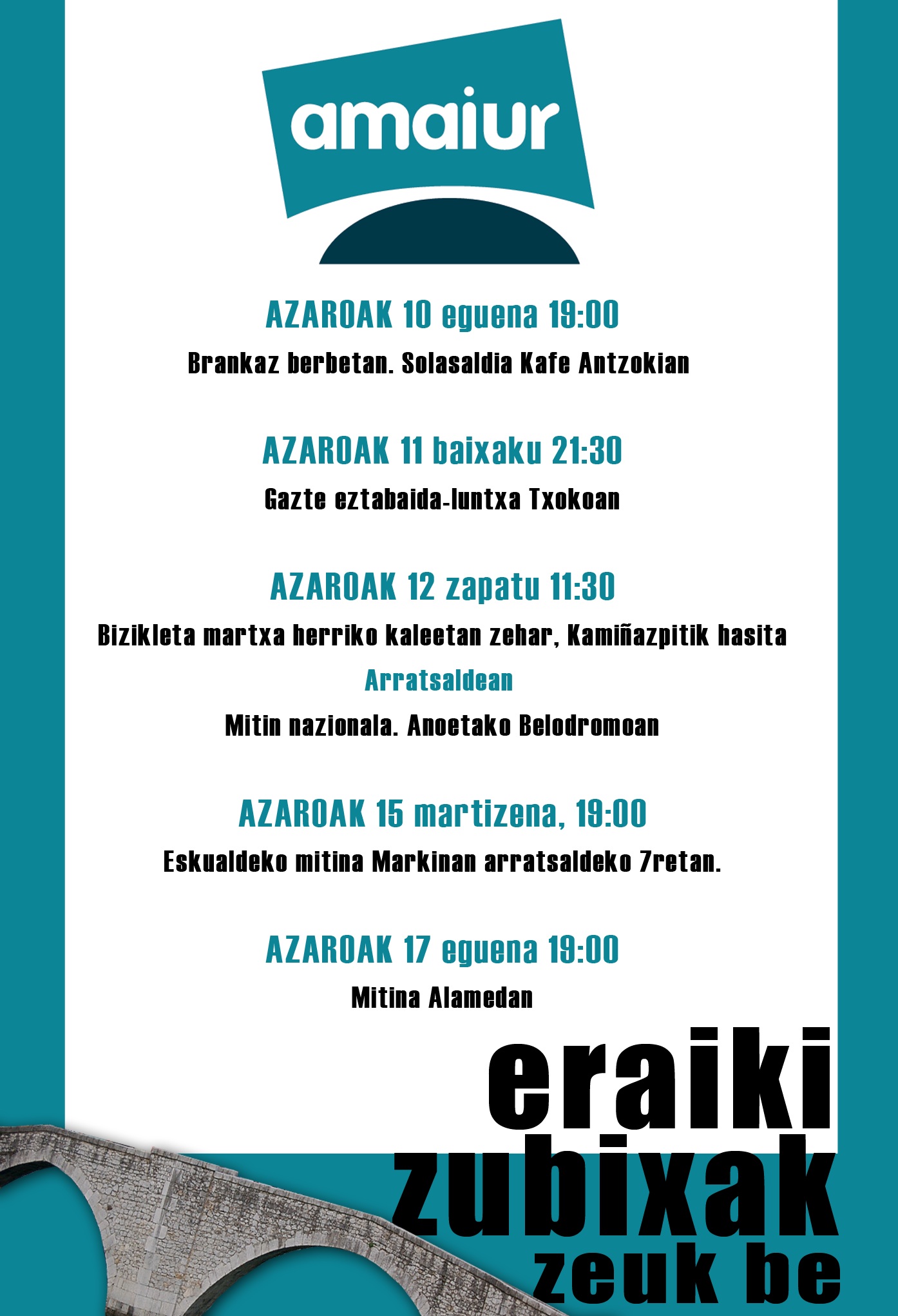 Baina begiratu dezagun aurrera. Hor daukagu gure Zubi Zahar ikastola. Duela 44 urte, Espainiako Gobernua gure umeei inposatzen ari zen hezkuntza espainiarraren aurka jeiki eta euskaran eta euskal kulturan oinarritutako hezkuntzari ateak ireki zizkion. Nolako baldintzetan borrokatuz, gainera! Eta egun ere, bide berari tinko eutsiz, jai arrotzei ere intsumisioa egiten ari zaiguna.