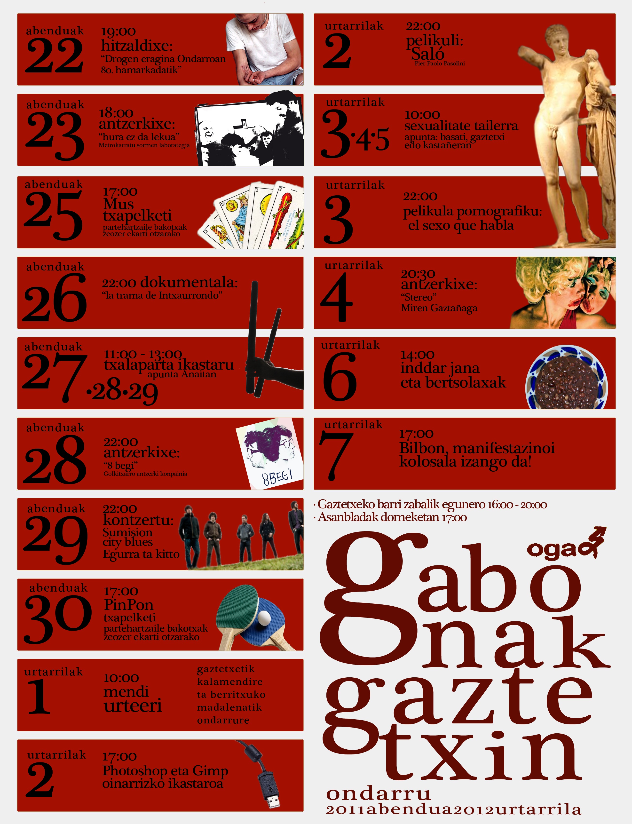Gaur hasten da gabonetako gaztetxeko egitarau. Eta hasteko, hitzaldi interesgarri bat: Drogin eragine Ondarrun 80. hamarkadatik. Hantxe ikusiko gaz.