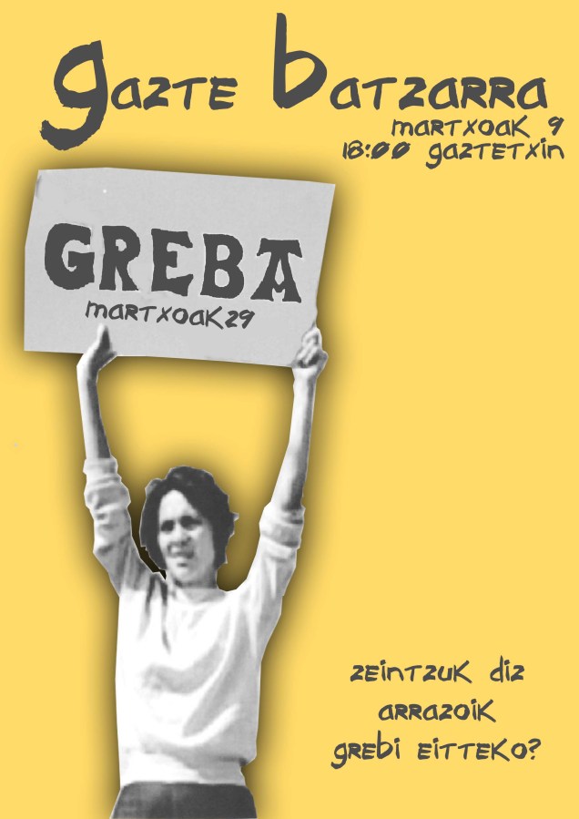 Gazte batzarra, grebi dala ta 2012/03/072012/03/07turrune Herriko gaztik be martxan daz, grebi dala eta zeozer antolatu naxan. Batzarra deitxu dabe, baixakurako, gaztetxin. Partekatu hau: Click to share on Facebook (Opens in new window) Facebook Click to share on X (Opens in new window) X Atsegin dut Kargatzen...