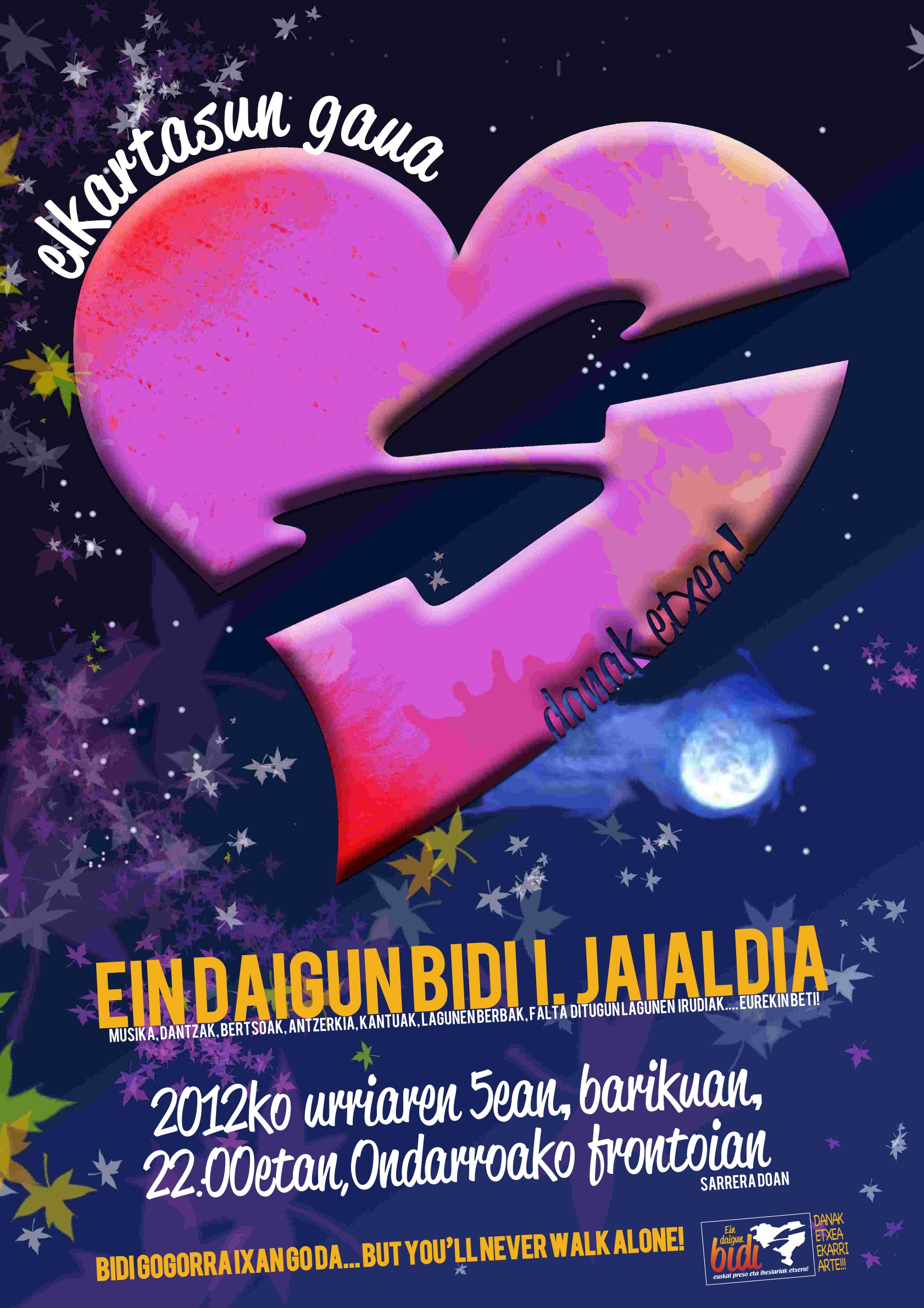 Urriak 5 (baixaku): elkartasun gaba, frontoin 2012/10/012012/10/01turrune Datorren baixakun elkartasun gaba ospatuko da herriko frontoin herriko preso eta iheslaixan alde. Herriko artista askok parte hartuko dabe, eta ziur ikusgarrixe ixango dala. Bertan ikusiko gaz. Danak etxea ekarri arte, ein daigun bidi! Partekatu hau: Click to share on Facebook (Opens in new window) Facebook Click to share on X (Opens in new window) X Atsegin dut Kargatzen...