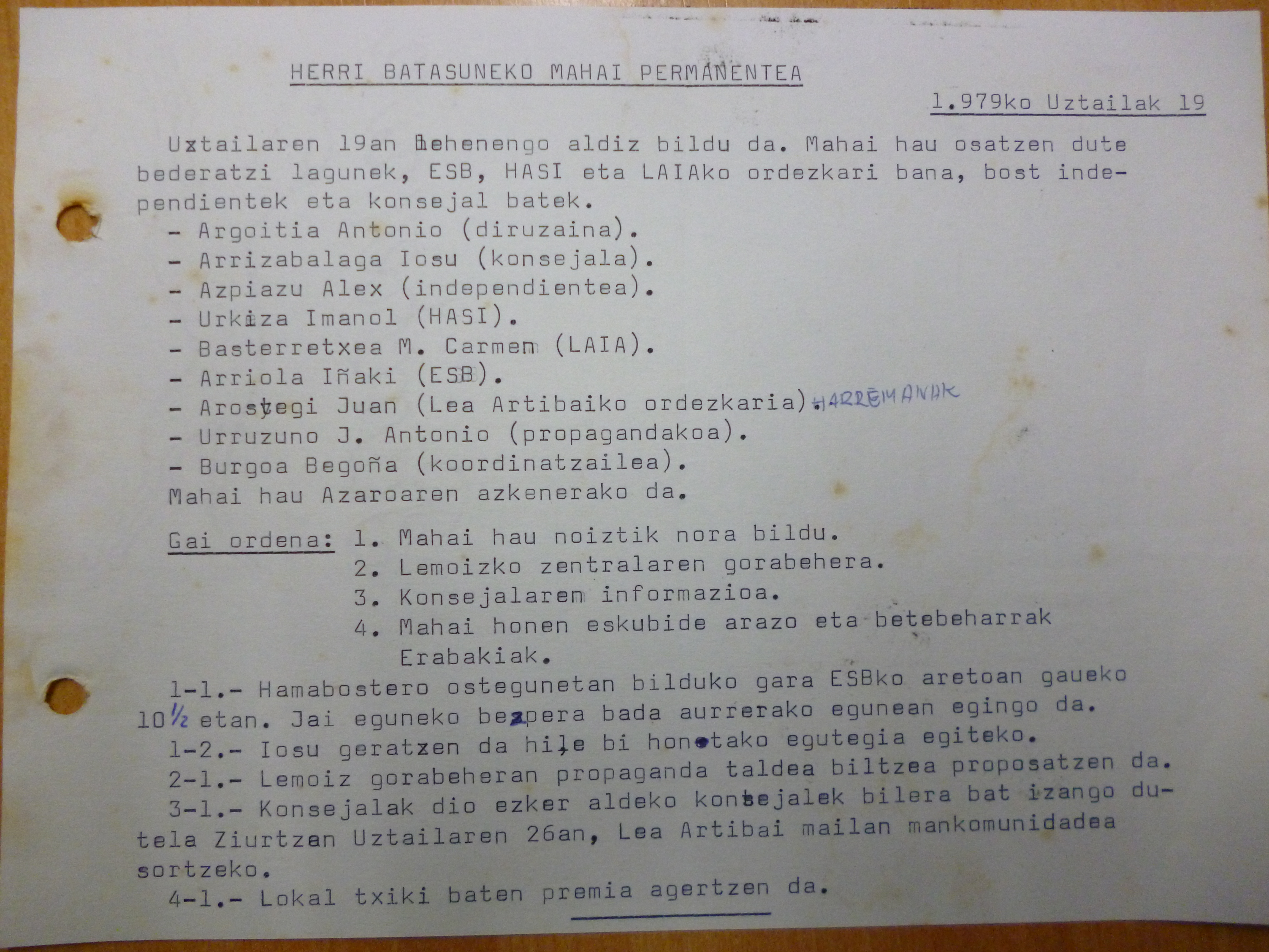 Egun hauek Ezkertiar ta Abertzaliok erakunde barrixe sortu nahixan gabizen egunak diz, ta ilusinoi eta inddar guzti ga ipintxen, erakunde berri hori gure herrixan ondo sustraituko dan esperantziaz. Baina argitxu bir dou ONDARRUTARROk aurrekari sendo bat euki douela, HERRI BATASUNA. Behian agertzen dan argazkixan 1979xan lelengo herriko mahaixan batzarreko akti agertzen da.