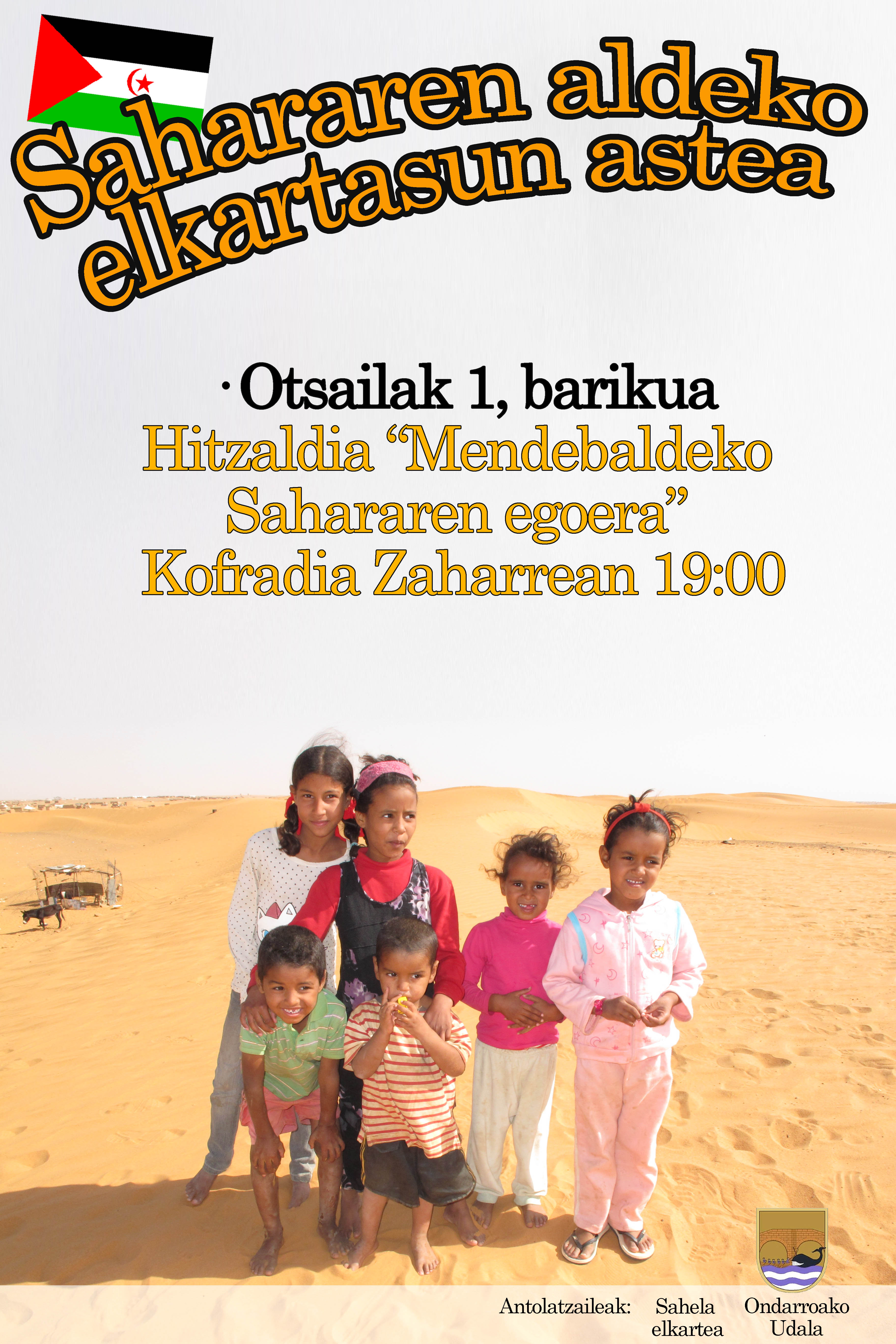 Aurtengo Sahararen aldeko elkartasun kanpaina amaitzeko, hitzaldi bat egongo da datorren ostiralean arratsaldeko 19:00etan Kofradia Zaharrean. Bertan, momentu honetan Saharako egoera zein den azalduko digute Hasanna Aalia giza eskubideen aldeko Saharako ekintzaileak eta Jesus Garay Sahararen adiskideen Arabako elkarteko kideak.