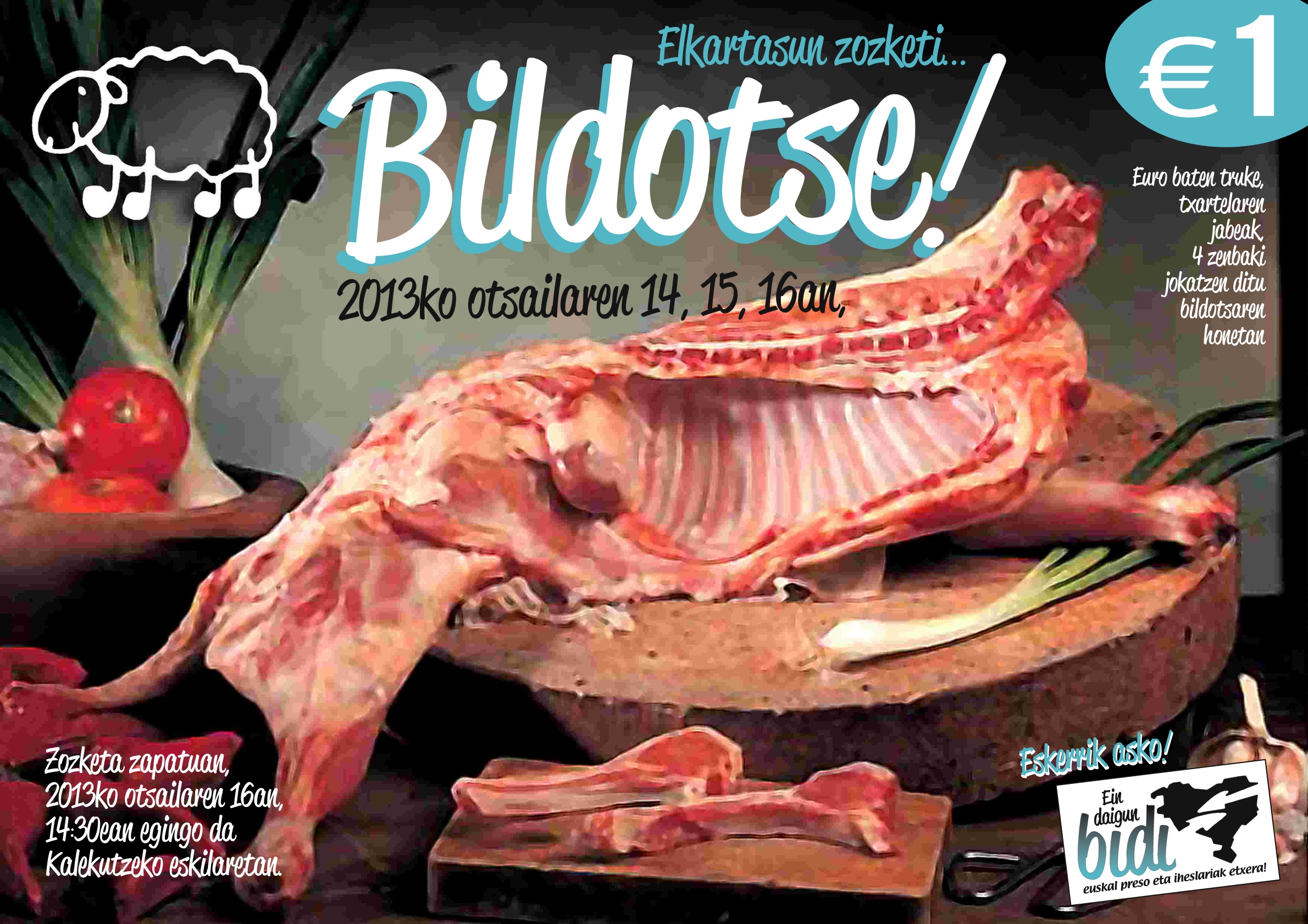Ein Daigun Bidiko Sostengu Taldi biharrin dabil. Bixar eguenin, Pintxopotin hasi eta zapato eguerdirarte, bildots baten zozketako txartelak saltzen eongo diz Zubi Zahar eta ingurutan. Zozketi, hilan 16xan ixango ra, eguerdiko ordu 2txerdixetan Kalekutzeko eskillaretan: Euro baten truke, bildotse! Etxaassss!