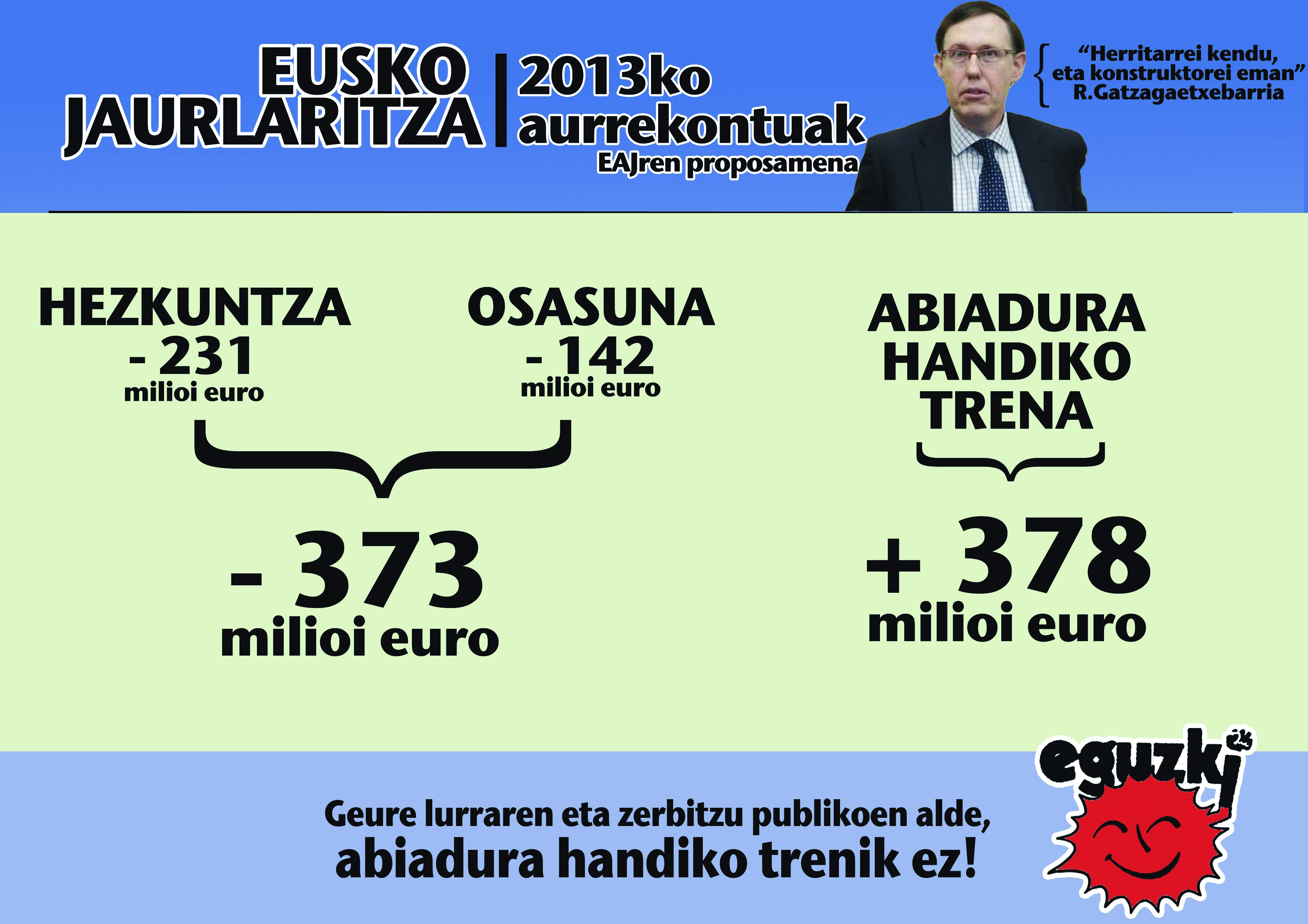 Lea Artibaiko eguzkik hauxe kartela ata dau. Bertan argi ikusten da gure herritxar Gazagaetxebarriak zerrei emoten dotsan garrantzi gexaua, Jaurlaritzako aurkeztu daben aurrekontu proposamenin. Hezkuntzatik eta Osasunetik kendu, Abiadura Handiko Trenai emoteko. Hobeto esanda, AHT eingo daben konstruktorai emoteko.