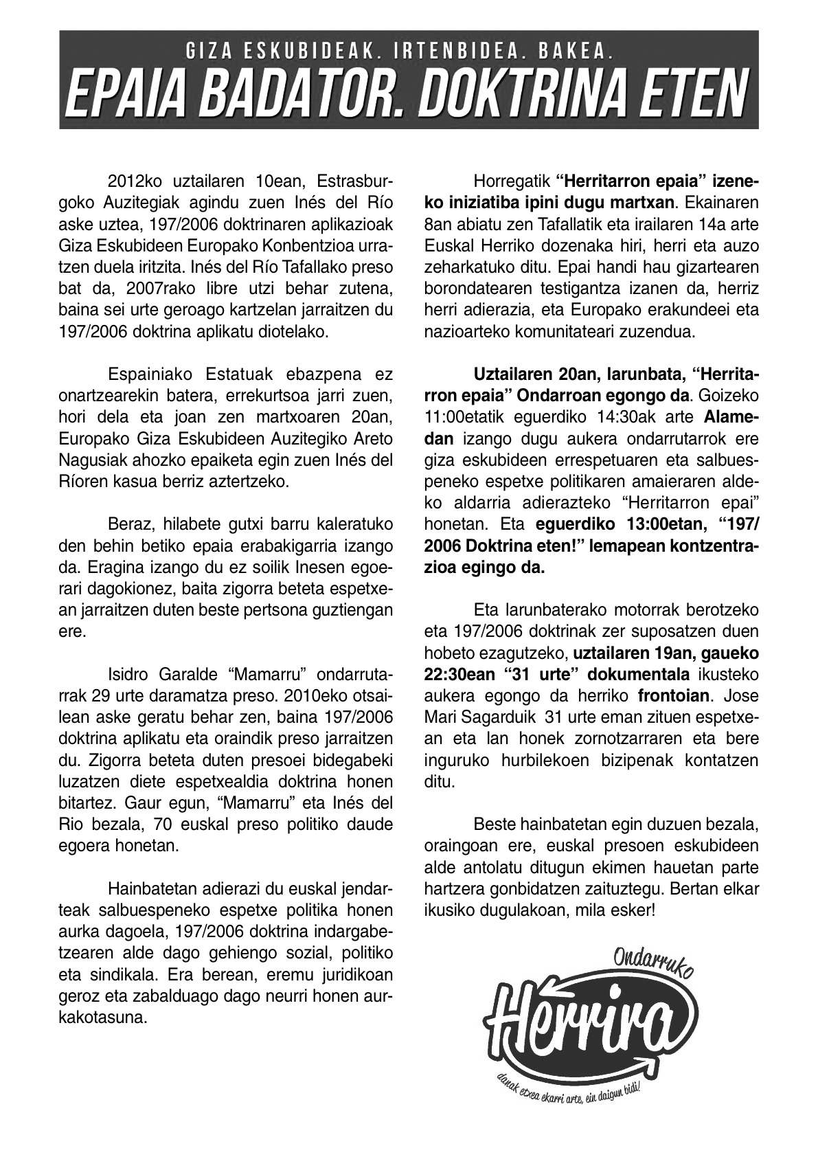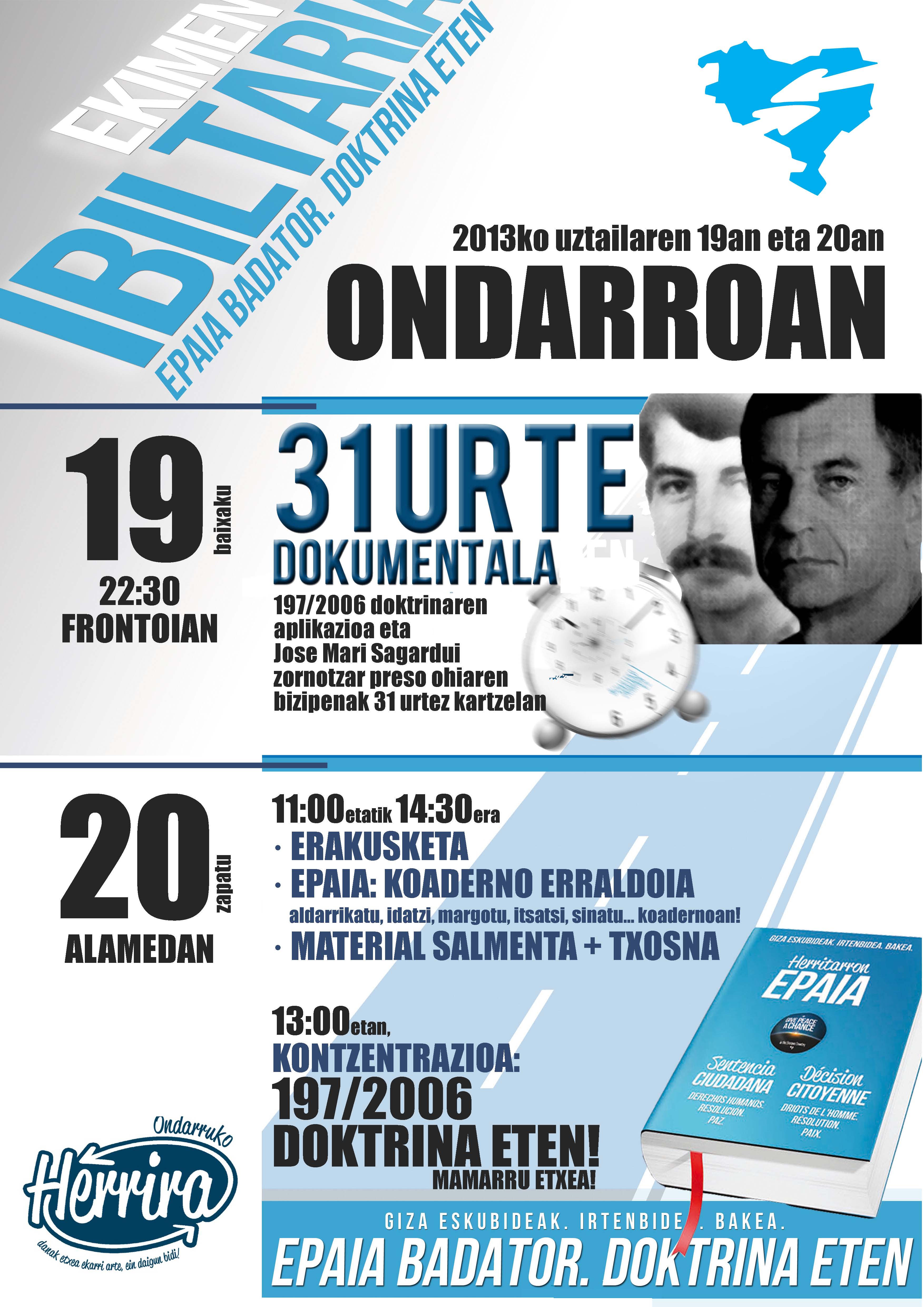 Zapatun Alamedan bertan, eguerdiko 13:00etan ordu laurdeneko elkarretaratzi ixango da 197/2006 dotriñi indargabetzeko eskatzen. A! Alamedan Kuadernuaz batea, Ondarruko Herrirakuk mateixala saldukou eta txosni be ipinitxe egongo da.
