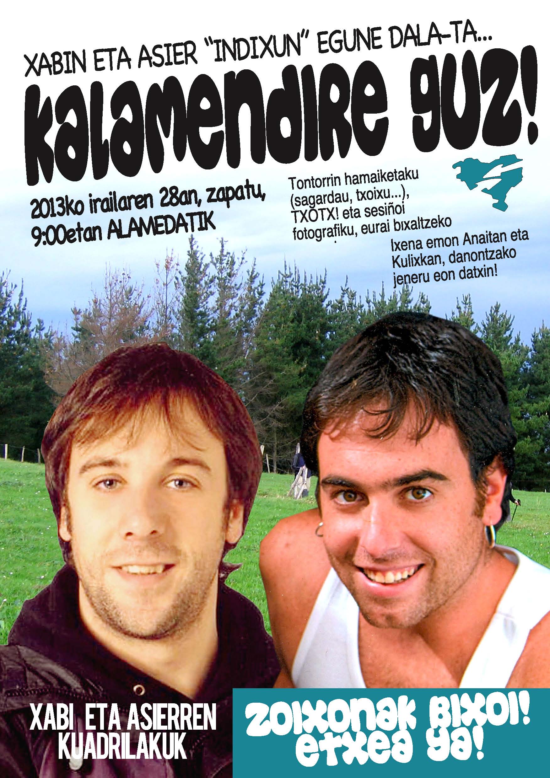 Datorren zapatun XABIn eta ASIERen lagunak antolatute Kalamendire mendi irteeri eongo da, Alamedatik urtengo dau goxeko 9xetan. Juteko asmu dakazuenok emon zeuen ixenak Anaitan eta Kulixkan, jateku kalkulateko gehixenbat. Ez da ixe pasaten atzanengo momentun agertzen bazaze, jateku sobran eongo dalako. Bixan egune ospatzeko jantzi mendiko botak eta erain trastiai (bidin perrotxikoren bat edo beste topa ezkeo, antolatzallik rekisa eingo dabela jakinan gainin zaze)