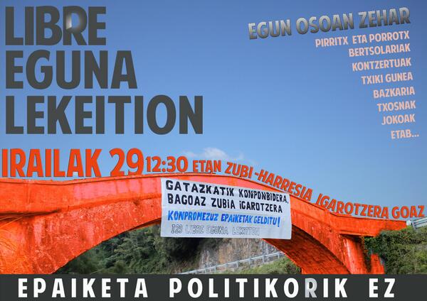 Datorren domekan (irailan 29xan) Lekatxon egun osoko aldarrikapen egune ospatuko dou. Bertan salatuko douz hurrengo hillabetitan eingo dizen epaiketa politikuk. Pentsaten dou sasoi dela esateko NAHIKUREla, eta jai eta salaketa bidez egun pasi eingou. Azpixan dakazue egun horretako egitarau