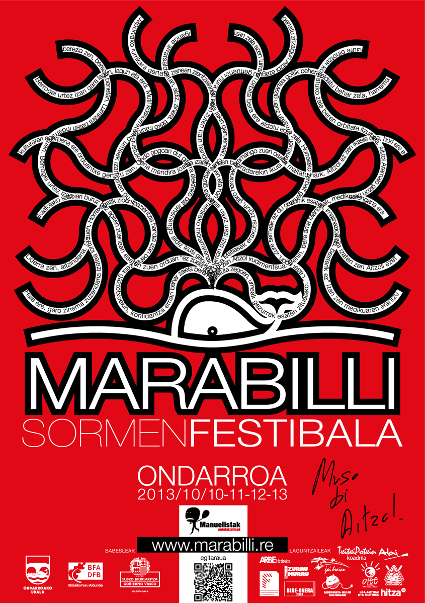 Mezu honen bitartez jakinarazi nahi dizuegu, 2013an ere MARABILLI SORMEN FESTIBALA izango dugula Ondarroan, URRIAREN 10etik 13ra, hain zuzen ere. Manuelistok, Aitzol Aramaio Bengoetxea ondarrutar zinegilearen omenez antolatzen dugun festibala dugu berau: iazkoa estreinako aldia izan zen eta lortutako arrakasta ikusita, aurten ere bigarrena antolatzea erabaki dugu. Iaz egin bezala, aurten ere bi aurkezpen egingo ditugu, bata Ondarroan eta bestea Bilbon.