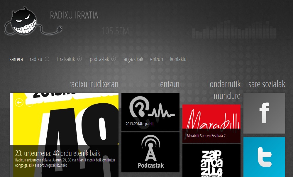 Gaurtik domeka, Radixuk 48 ordu eingo dotxu para baik, beran 23 urteurrena ospatzeko. Jakin badakixue internetetik be ahal dozuela entzun, radixu.info klik eindde! Ah, eta radixuk beran interneteko orrixe barritxu dabela, eta hamendik aurrea programa guztin artxibo zaharrak entzun ahalko dizela. Eskerrik asko Radixokuai!