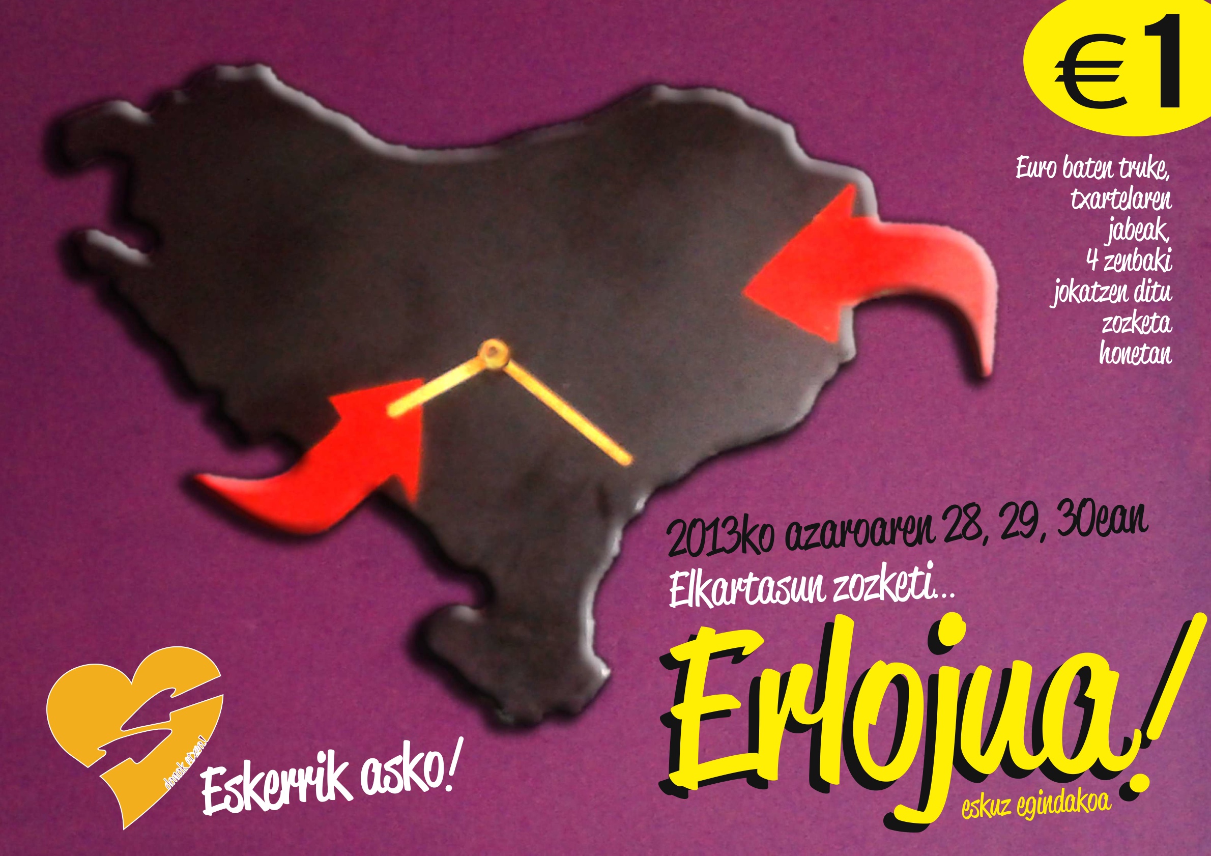 Ondarruko presun eta iheslaixan eskubidin aldeko sostengu taldekuk, beste zozketa bateaz datoz oingun. Ezta otzari, ezta bildotse… Erloju re! Egurrin eskuz enddaku eta espresamente zozketa honetako… Akorda holako erlojuk ez dizela dendetan saltzen! Txartelak pintxopotin hasiko diz saltzen, eguen iluntzin eta zapatun atako dabe numero irabazli.