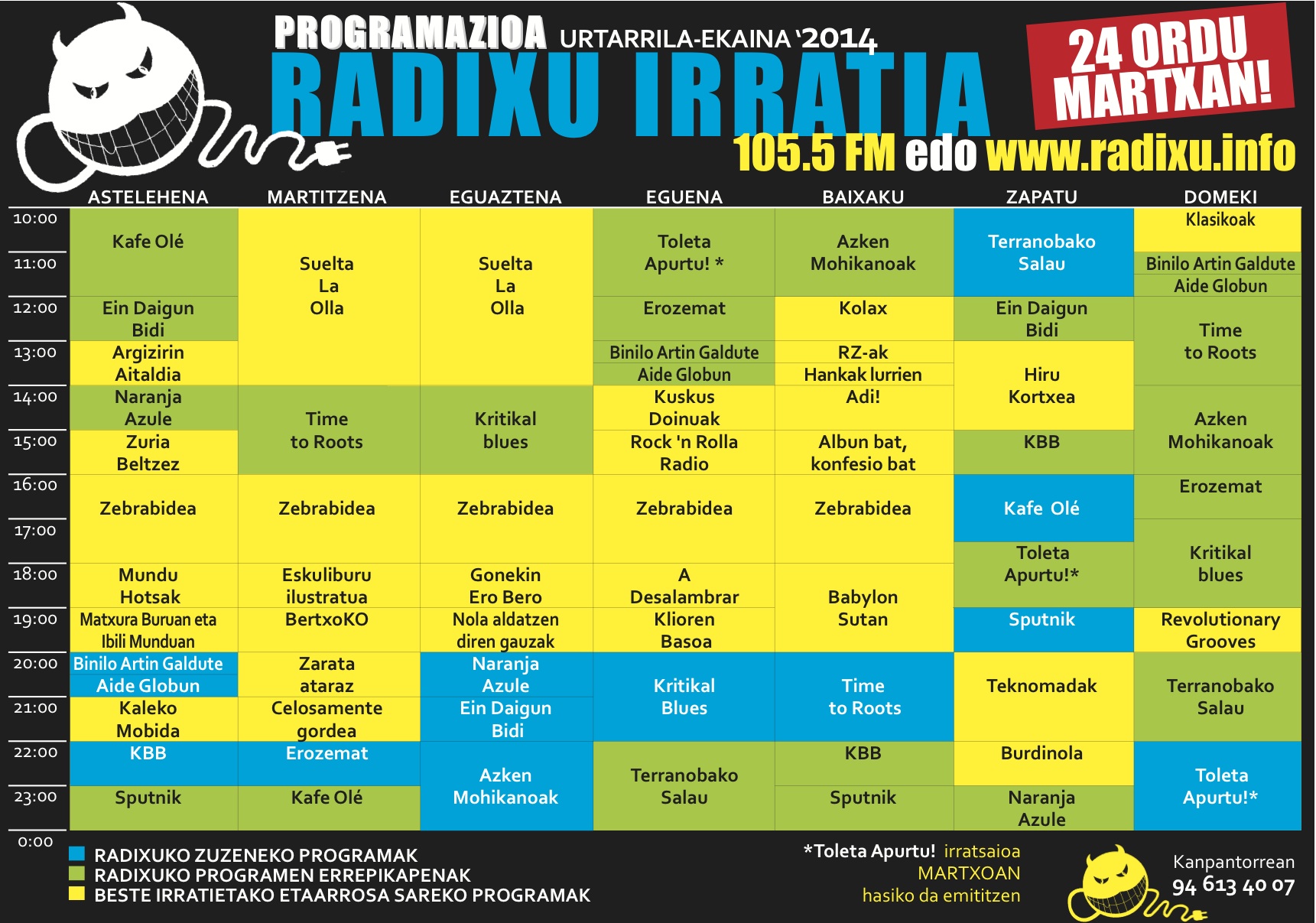 Radixu Irratiak programazinoi barrixe dauke, eta 105.5 FMn edo www.radixu.info orrixan entzun ahal dozue.