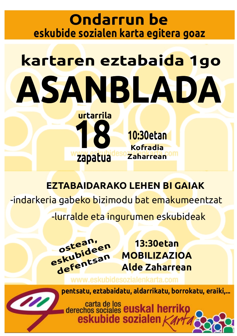 Gaur Kofrai Zaharrin batu gaz, geure eskubide sozialak zeintzuk ixan bir dizen erabakitzeko. Ingurumen eta bardintasun eskubidin kasun einddou berba, orokorrin, eta Ondarru mailan. Dakixuen modun, Euskal Herriko talde asko dabiz karta sozial bat preparaten, biximodu duin bat eukitxeko beharrezkuk dizen eskubidik zehazten. Parte hartu nahi dabenak, aukera gexa eukikotxuz hurrengo astitan. Anima!
