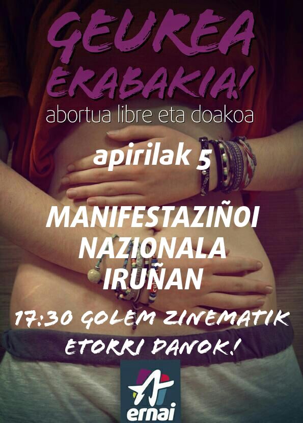 Datorren zapaturako deialdi nazionala da, Iruña jun eta aborto eskubi defendatzeko. Ondarruko talde askok be bat ein dabe deialdixaz (Uxu, Ernai,ikasle abertzalik…) eta autobuse egongo da Ondarrutik. Anima eta defendiu geure eskubidik!
