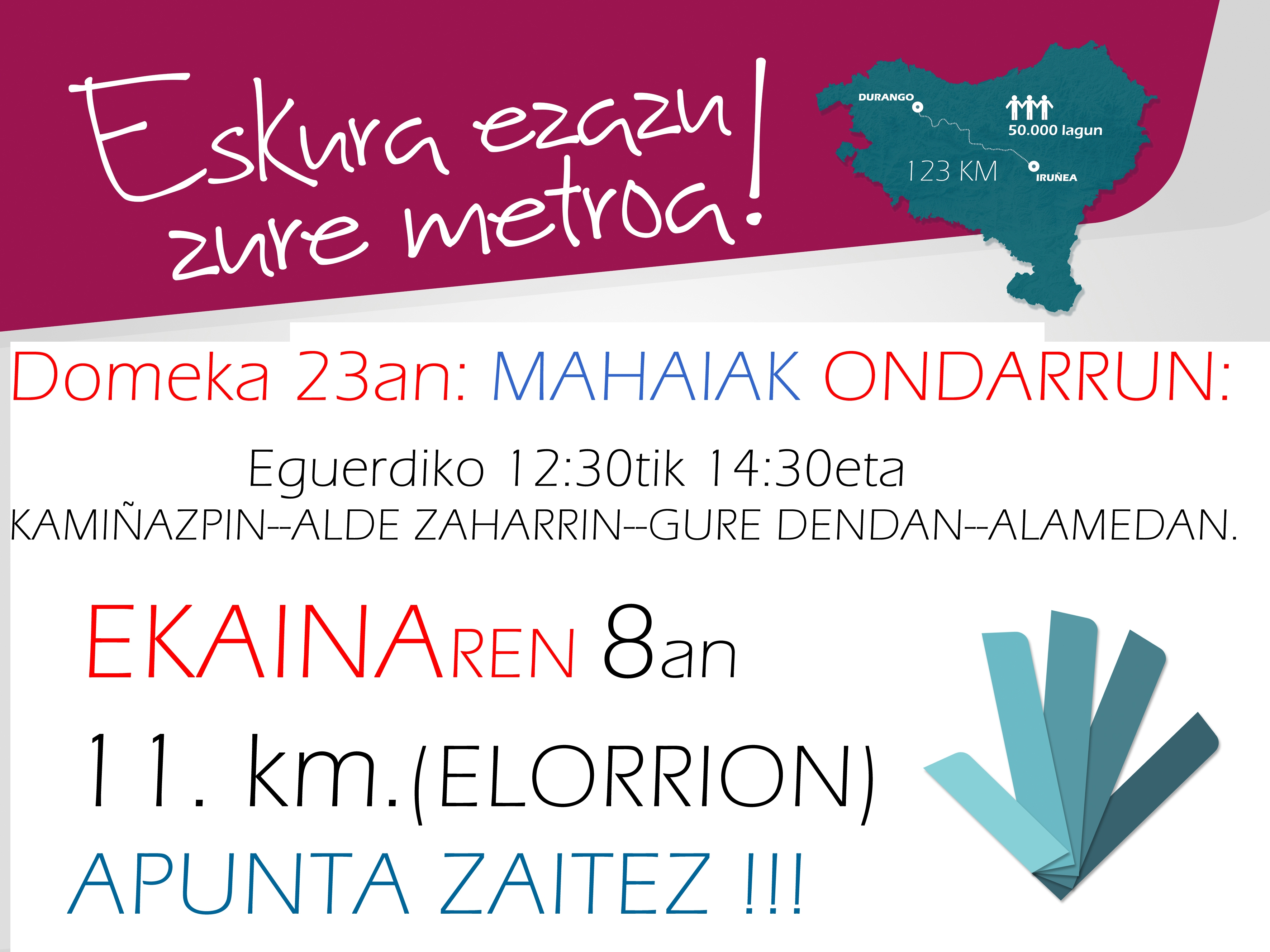 Gero,12.30xetatik 14:30eta, “ESKURA EZAZU ZURE METROA” kanpainin barrun, Euskal Herriko herri guztixetan eta ordu bardiñetan, maxak jarriko diz.