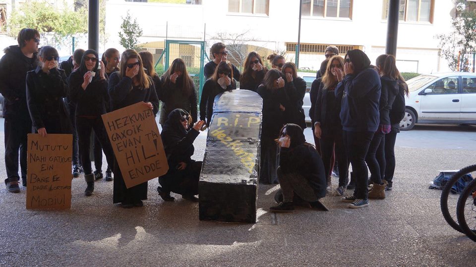 Goxin antzerki bidez (ikaslik baltzez jantzitxe kalejiri ein ben), gaurko hezkuntzin enterru irudikatu ben.