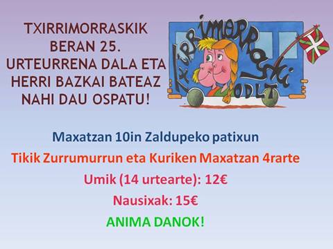 Buf! 25 urte pasari Txirrimorraski sortu ben lehelengo begiralik Gurean, Lagun Artean eta Alamedan batzen zinetik… Ta ze ezta pasa atzan 25 urtitan? Bueno, ezgaz hasiko danak kontaten… Gauzi re, Txirrimorraskik para baik segi einddabela aurrea eta 25 urte betetxuzela, hasieratik eukitxuzen Txirribalorik Euskal Herrixan zir zabaltzen Ondarruko umikin batea!
