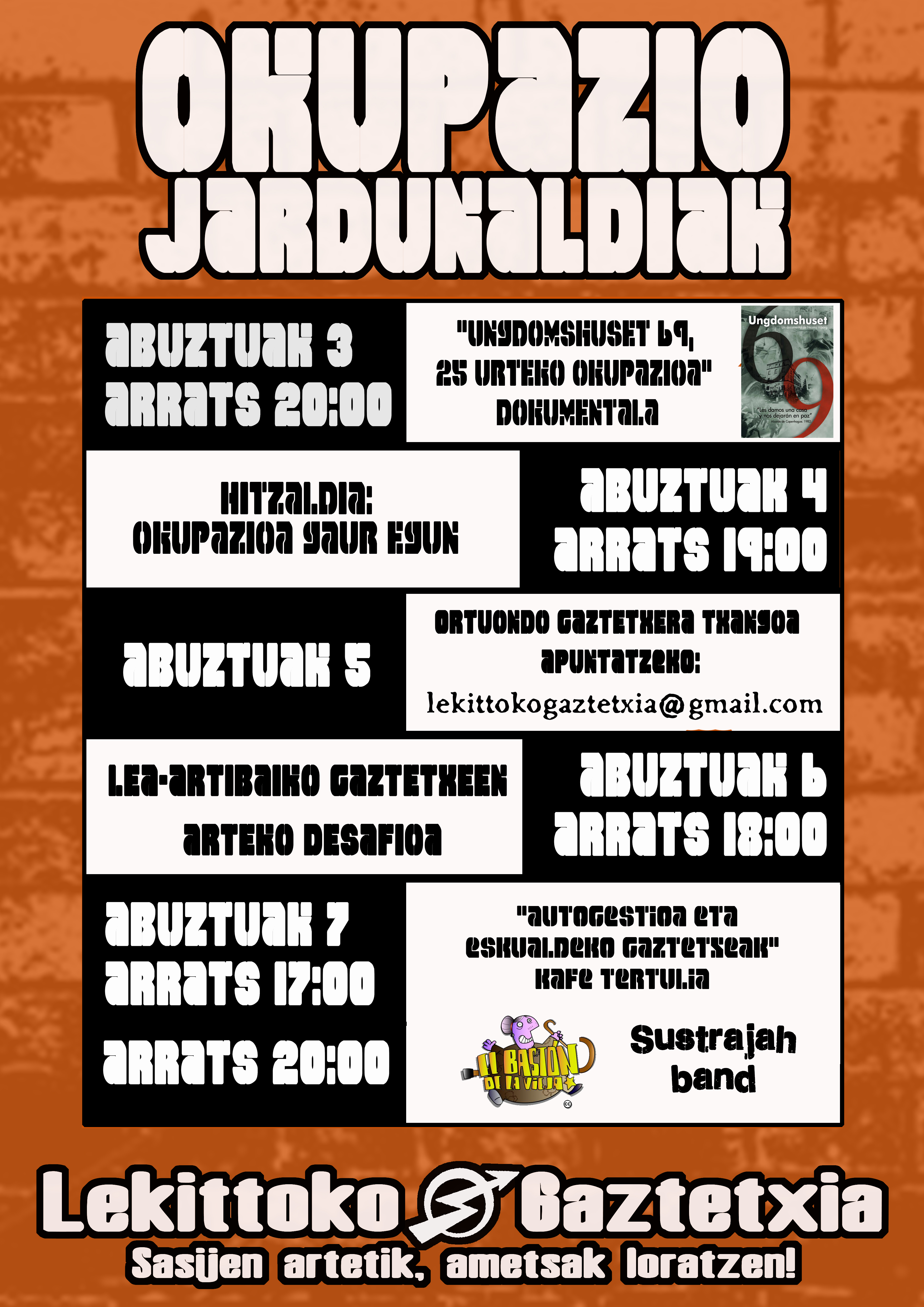 Gaztetxien okupazinoiaren urteurrenaren harira, abuztuaren 3tik 7ra OKUPAZIONO JARDUNALDIJAK antolatu doguz Lekitxon. Euskal Herriko gaztetxe ezberdinetako esperientziJak ezagutzeko aukerIa eta aurrera begira hartu bIharreko bidia zehazteko oinarrij…ak finkatzeko erabiliko doguz.