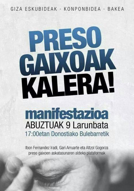 Abuztuak 9 (zapatu) manifestazinoi Donostin: Preso gaixoak kalera! 2014/08/07turrune Iparra Galdu Baik plataformin oharra: Larunbatean Donostian Preso Gaixo Larrien etxeratzearen aldeko manifa dagoenez, Ondarroan astero egiten dugun eguerdiko kontzentrazioa bertan behera utziko dugu. Partekatu hau: Click to share on Facebook (Opens in new window) Facebook Click to share on X (Opens in new window) X Atsegin dut Kargatzen...
