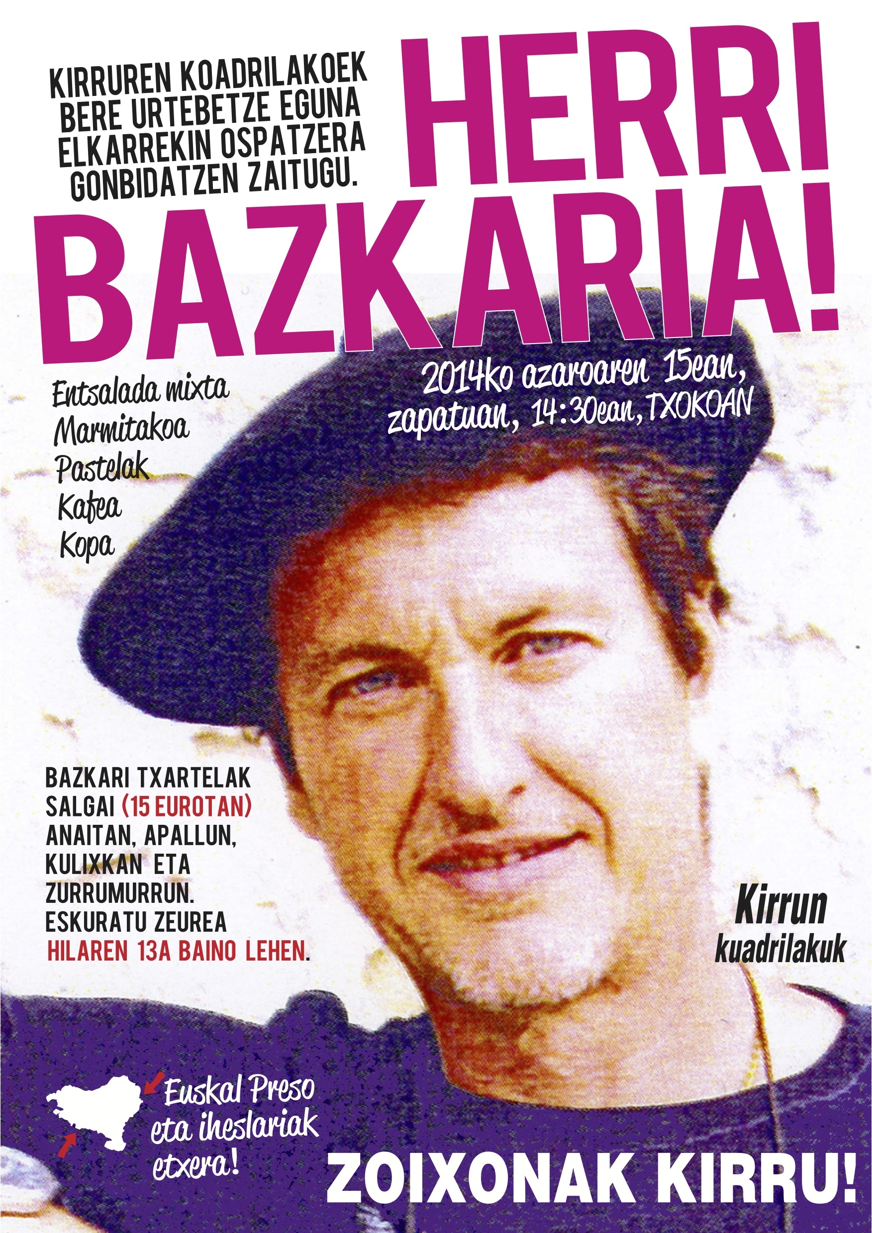 Gaur Kirruk urtik beteten dotxu 2014/11/062014/11/06turrune Hori dala ta, azarun 15in beran kuadrilakuk bazkaire gonbidatzen zatxue. Atsegin dut Kargatzen...