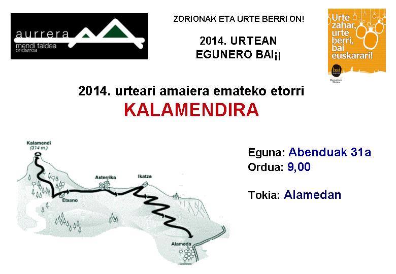 365 egun dauke urtik, eta egun bat be eztou huts egin KALAMENDIre jun baik. Behin baño gexa justu ibili ga ( dana esan birde), bañe euri edo eguzkixe egon, aste barrun edo aste bukaeri ixan, guk berbi bete dou. AURRERA MENDI TALDIK eta UDALEKO KIROL BATZORDIK bultzatutako ekimena ixan da eta herrittarrak babesa emotze. Laster erakusketaren bat eta estatistikan ordu allako da bañe bittartin esan mendixak leku bardiñin jarraitzen dauela eta nahiz eta erronki amatxu, mendire juti beti dela osasuntsu.