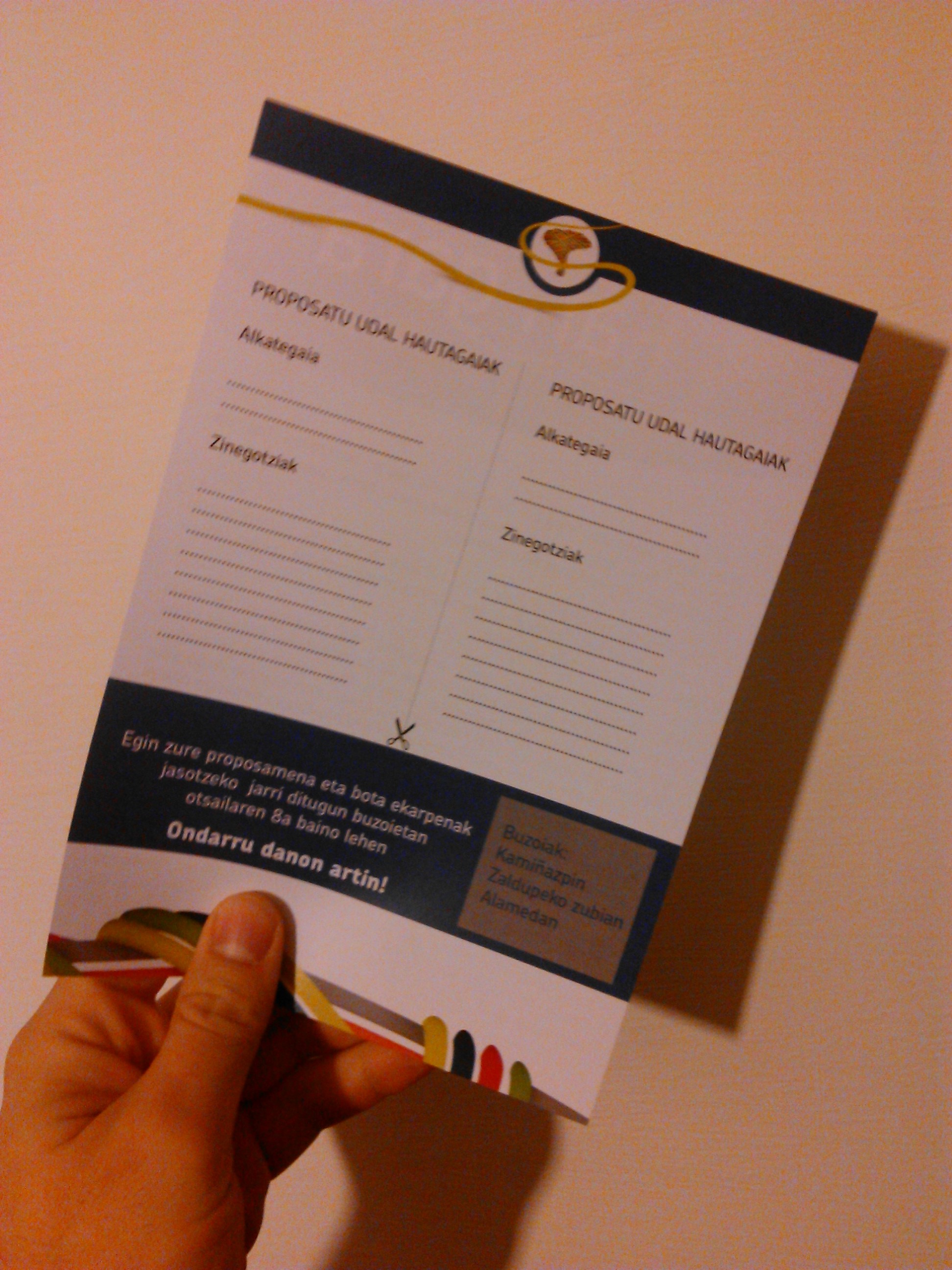 Zinegotzixan eta alkatin ixenak proposatzeko, herriko buzoi guztixetan jasokozue EH Bilduk bixaldutako orri bat. Bete orrixe, eta bota astelehenetik aurrea herrixan ipiniko dizen buzoitxan: Zaldupen, Alamedan eta Ibaiondon. Danok ezautzen dou ingurun jente egokixe, herrixan alde biharra etxeko gogu dakarrena.