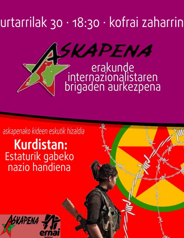 Ernai eta Askapenak hitzaldi bat antolatu dabe Ondarrun Kurdistanei buruz. Kurduk estatu baiko nazinoi bat diz, estatu baiko munduko handixena, eta urtik daruez euran askatasunan alde burrukan.