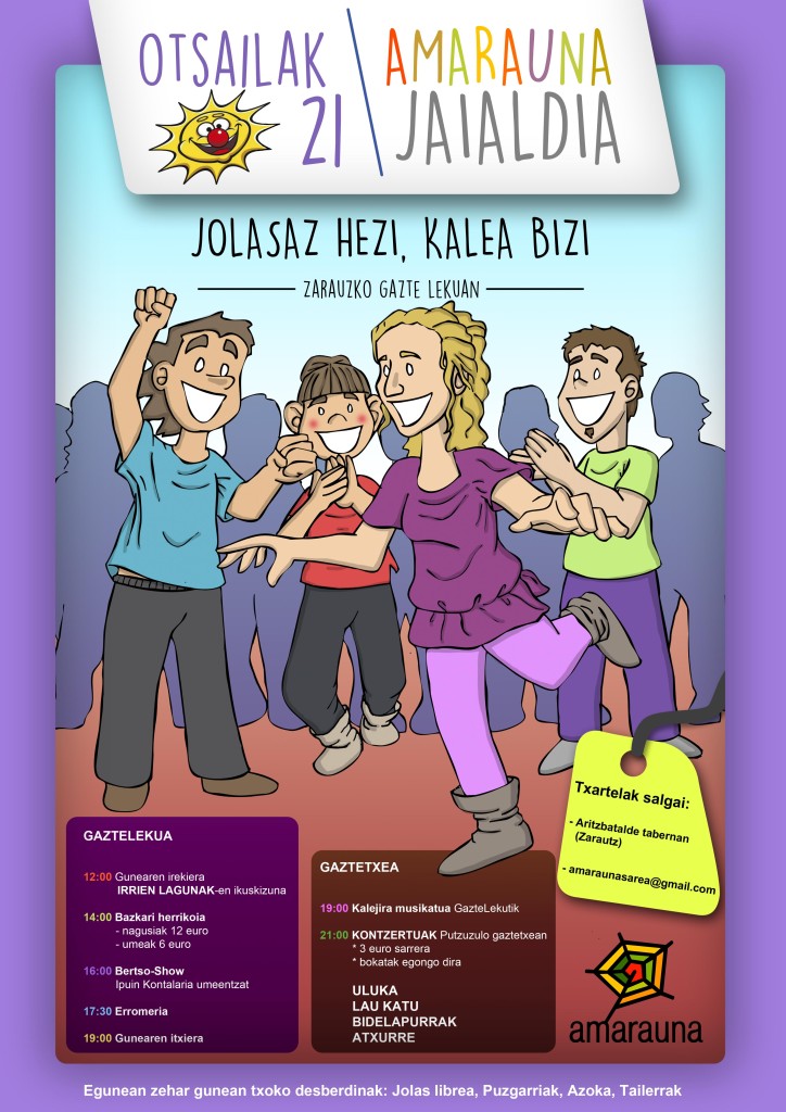 Txirrimorraskik gonbidapena bixaldusku, datorren zapatun Zarautzea juteko. Zeta Zarautzea? Ba Jolasaz Hezi Kalea Bizi jaialdire. Euskal Herrixan aisialdixe lantzen daben taldin jaire. Egun ederra pasateko aukeri dakazue, eta bide batez Txirrimorraski lakoxe taldik laguntzeko aukeri be bai.