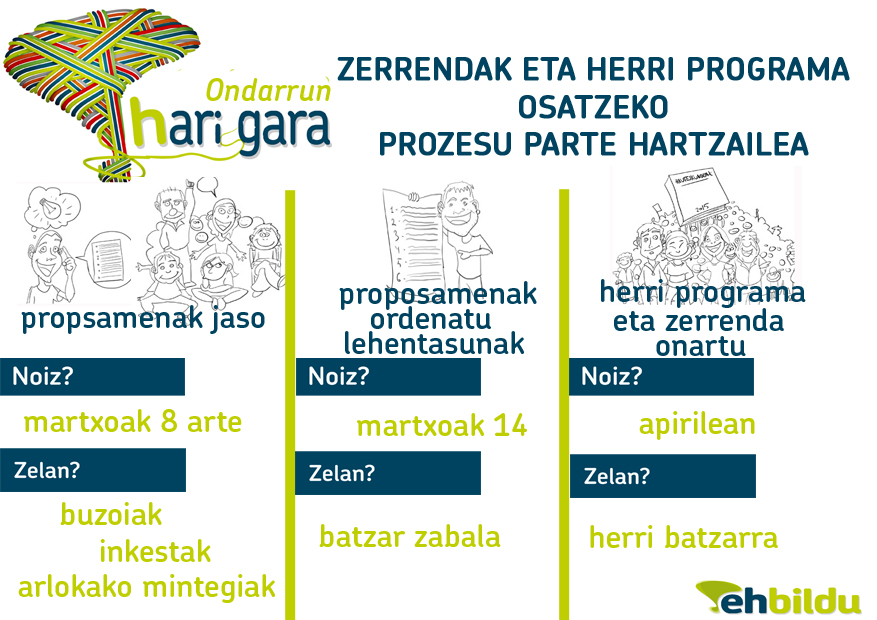 Hauteskundik datozela eta, hoixe galderi etxen dosku EH Bilduk. Hauteskunditako programi herritxarrakin batea nahi dau ein, eta horretako hauxe ixango da egutegixe: