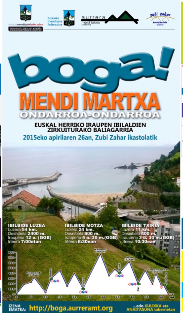 Hamen da aurtengo BOGA mendi martxi. Apirilan 26xan ixango da eta betiko lez hiru ibilbide eukiko dotxuz: luzi (54 km), motza (24 km) eta txikixe (11 km). Ixenak emoteko bi aukera dakazuez, bata, htp://boga.aurreramt.org eta besti ANAITAn edo KULIXKAn ixenak emonda.