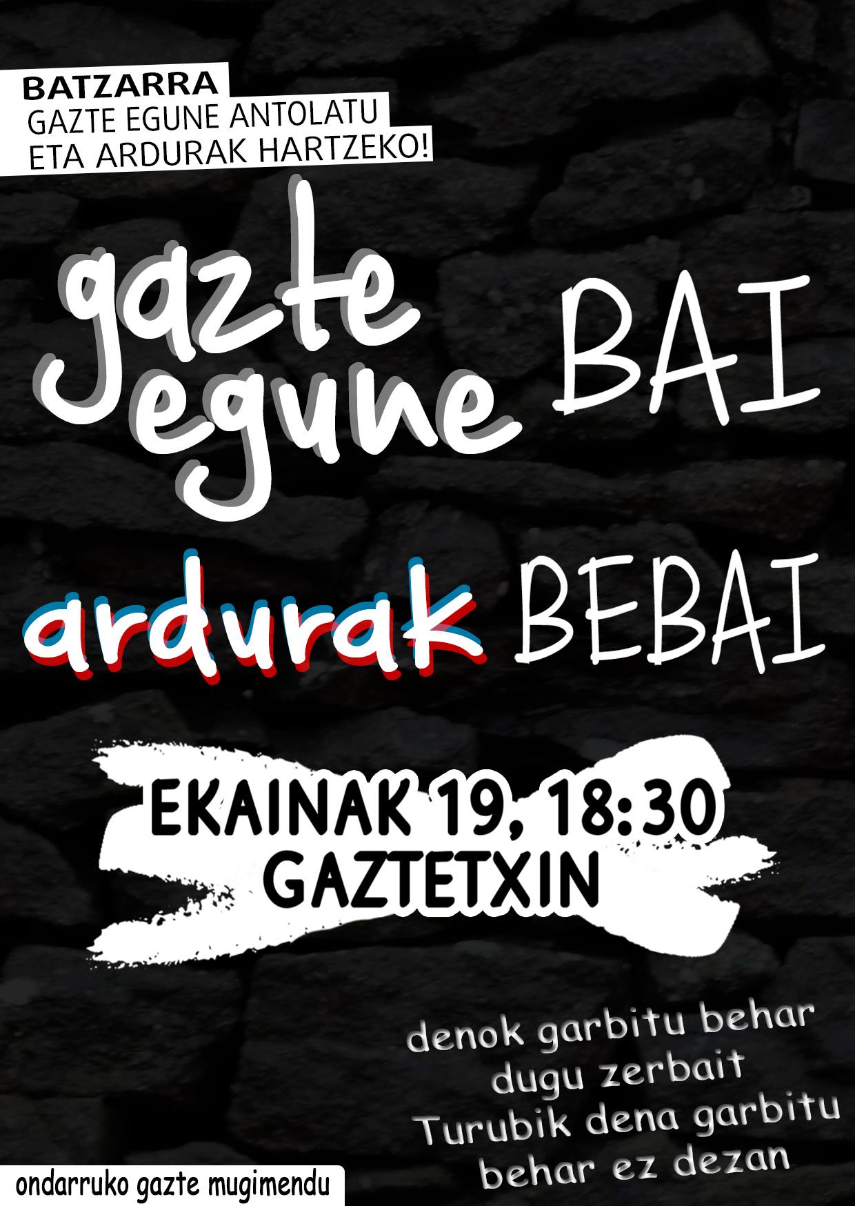 Aurten gazte egune antolatzeko, proposamen bat einddabe gaztik: bazkairako tiki eta kamiseti nahi dabenak, egune antolatzen lagundu biko dabela. Jokuk prepara, jateku serbiu, platerak garbitxu…