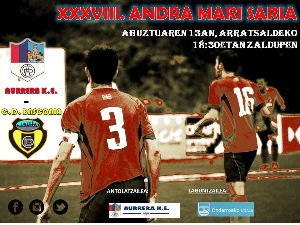 AURRERA K.E. hauxe idatzixau pasa dosku: Abuztun 13an, eguenin, jokatuko da XXXVIII. Andra Mari Sarixe Zaldupe Udal Futbol Zelaxan. Urte honetan, CD Basconia Basauriko taldi gonbidatu dou, geure latxeik aurten 3. mailan jokatuko daben taldi. Partidu irabazten daben taldik, XXXVIII. Andra Mari Sarixe jasoko dau berdegunin bertan, behin partidu amatxu ostin. Partidu berdinketiaz amatxuko balitx, penalti jaurtiketa bidez erabakiko litxake norentzat dan garaikurre.