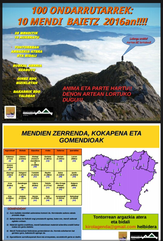Ongun “100 ondarrutarrek baietz 10 mendi igo 2016an” da kanpainin ixena. Kanpaina honen helburu Ondarrutarrok Euskal Herriko lurralde ezberdinetako 10 mendi altzati de. Aurtengo erronkan 25 mendi aukeratu diz, zailtasun ezberdinekuk, eta bertatik 10 mendi altzati eskatzen da.