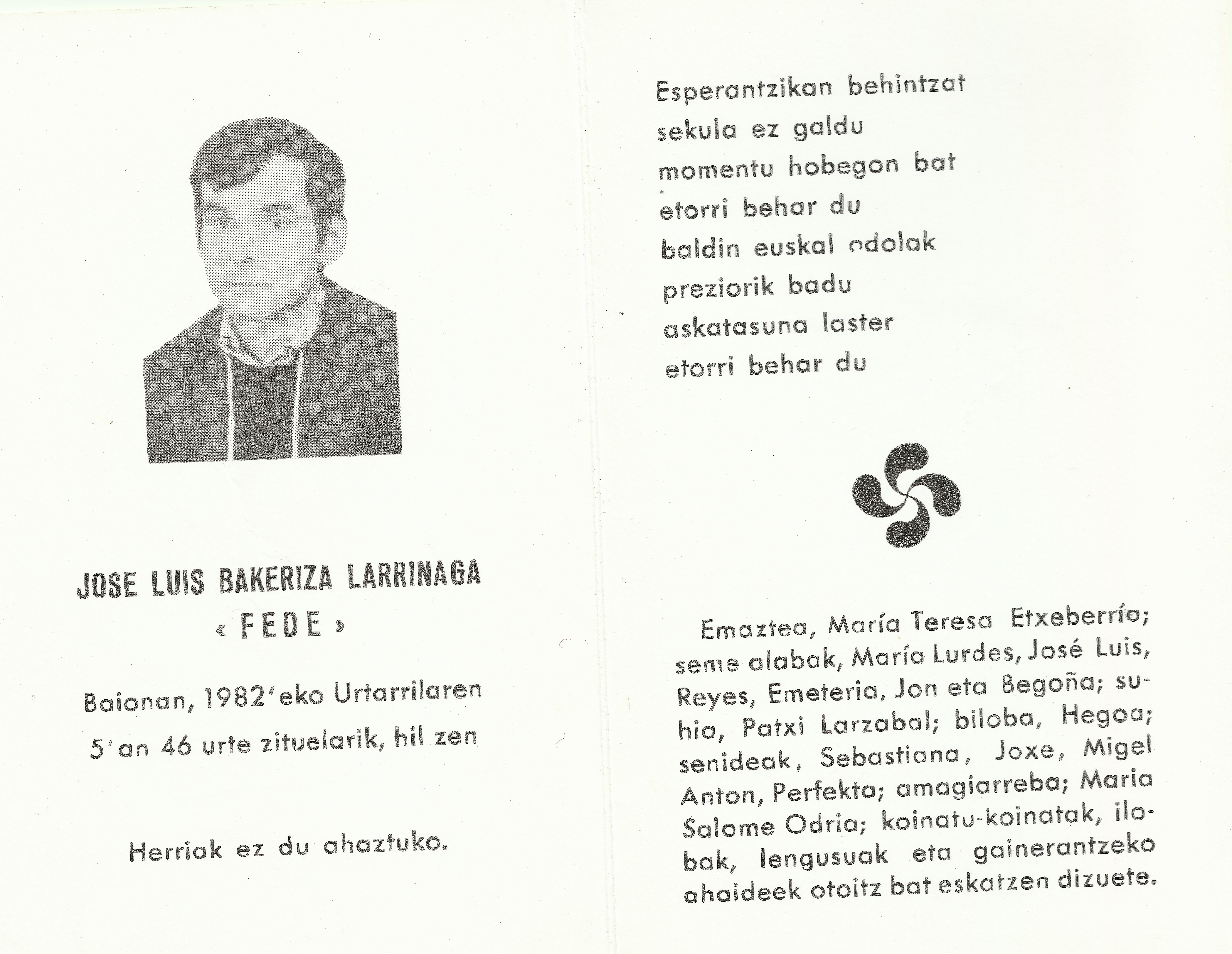 1982ko urtarrillak 5in hil zan BAXONAn JOSE LUIS BAKERIZA LARRINAGA Ondarruko semi. Bertan euan ihes eindde, beste asko lez. Hamen, ordun ata ben rekordatoxu beran omenez.TURRUNEtik memoixa historiku lantzen jarraitzen dou, nahiz eta euskal gobernuk JOSE LUIS biktimatzat ez daben hartzen. Guk kontutan hartzen douz errepresiñoik eragindako iheslarixak be. .