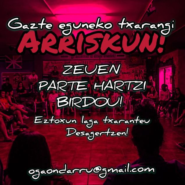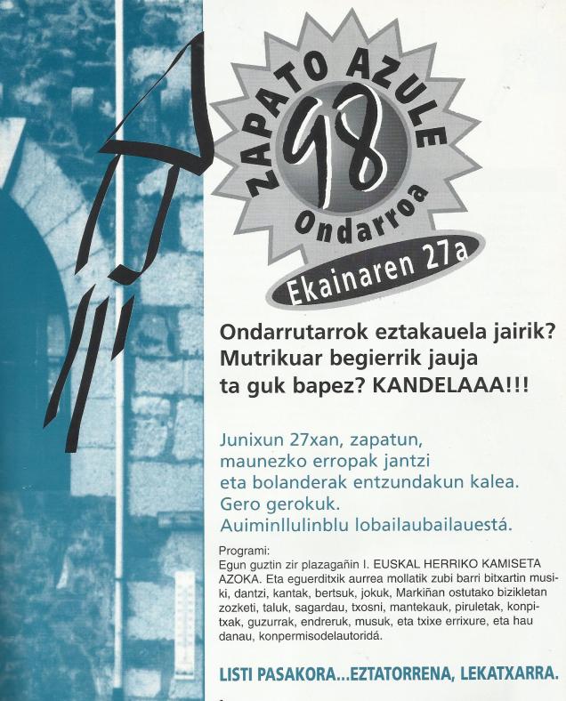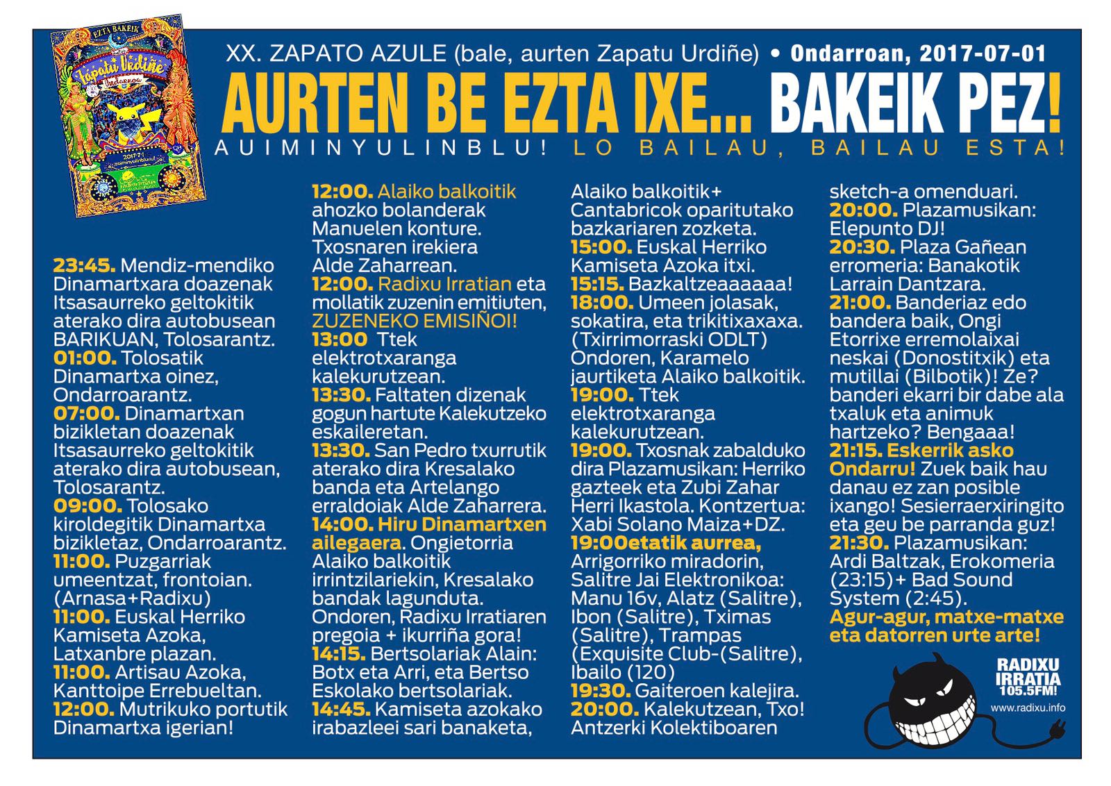 Radixu Irratixe eta Etxelilan arteko lanketin ondorioz aurtengo Zapatu Urdiñin intentsitate ezberdinetako eraso sexistak salatzeko telefono zenbakixe egongo da behar dabenak erabiltzeko. Telefono honen bitartez, zapatuko jai egunin emon leiken (hobeto ez badaz) eraso guztixak identifikatu eta behar dan neurriko erantzune emoti ahalbideratu nahi de. Aurten proba modun salaketa telefonu ipiniko da 13:00etatik uztailaren 2ko 8:00eta martxan, hurrengo astin telefonun baloraziñoi eingo da. Jai eremuk eremu aske bihurtzeko saiakera hau, hasieri baino ez dela azaldu dabe Radixu eta Etxelilako lagunak, ixan be aurrea begire lanketan sakontzeko asmu dauke. Ondo pasa jaxe bañe gogoratu, EZETZA EZETZA DALA!!!