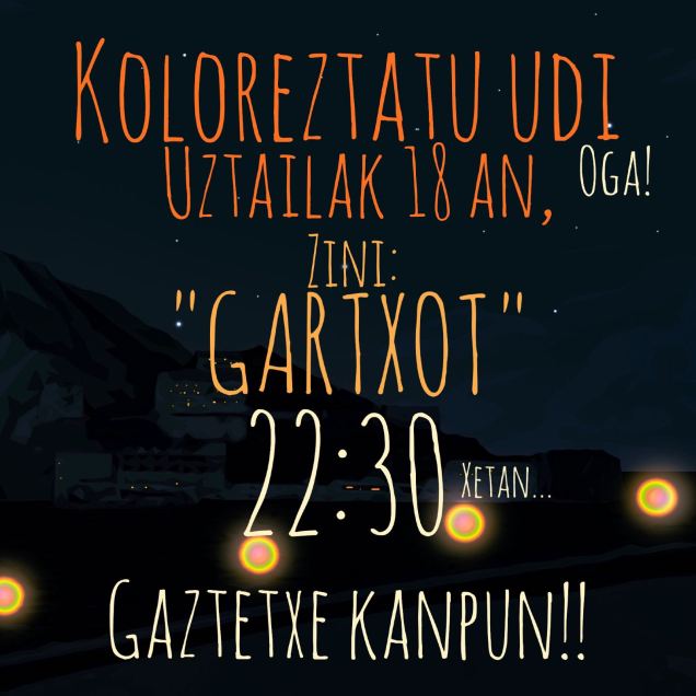 Gaur egongo da lehenengoko ekimena gaztetxin”koloreztatu udi” dinamikin barrun: gabaz,22:30 etan gaztetxe kanpun GARTXOT pelikuli.